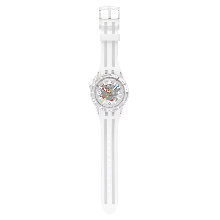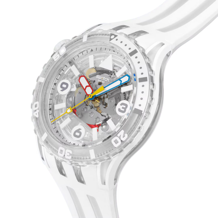 Cadranul transparent al acestui ceas de scufundare are indexuri imprimate albe, cifre imprimate gri, o limba orara rosie, o limba minutara albastra si o limba a secundelor galbena, toate cu efect glow-in-the-dark, sub sticla biosourced. Carcasa combina Bioceramic alb mat cu material biosourced transparent lucios si este completata de o luneta biosourced transparenta lucioasa, cu imprimeu gri si alb care lumineaza in intuneric, plus o coroana Bioceramic alba mata la ora 10. Cureaua transparenta mata si alba, cu o bucla alba mata si o catarama biosourced transparenta lucioasa, completeaza ceasul.