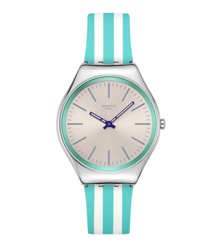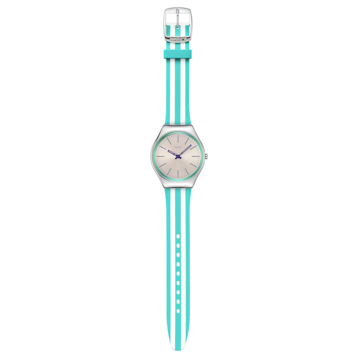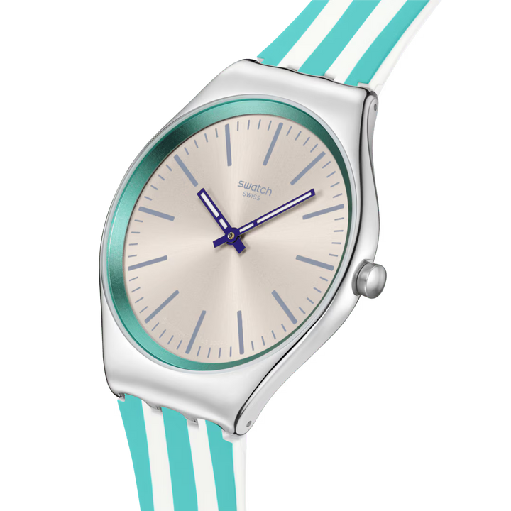 Acest ceas ultra-subtire are un cadran argintiu cu finisaj sun-brushed, flansa turcoaz, indici si marcaj minutare tiparite in gri, si limbi orare si de minute bleumarin cu efect glow-in-the-dark. Carcasa lucioasa din otel inoxidabil si catarama asortata sunt completate de o curea mata in dungi turcoaz si alb, cu o bucla turcoaz mata.