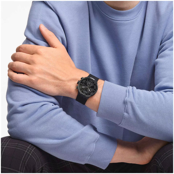 Noul BIG BOLD CHRONO CHECKPOINT BLACK (SB02B400) impresionează prin designul său distinctiv, care evidențiază funcția start/stop la ora 2. Cadranul cu model caroiat, în finisaj mat și lucios, este completat de o carcasă și curea negre, cu accente colorate subtile. Butonul cronografului de la ora 2 și contorul secundar de la ora 6 oferă un aspect tridimensional și modern, iar coroana supradimensionată adaugă un plus de ergonomie și caracter sportiv.