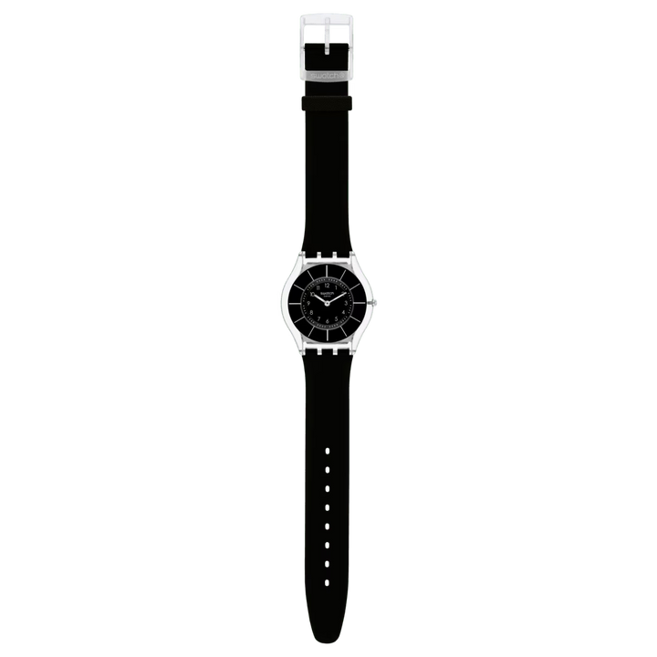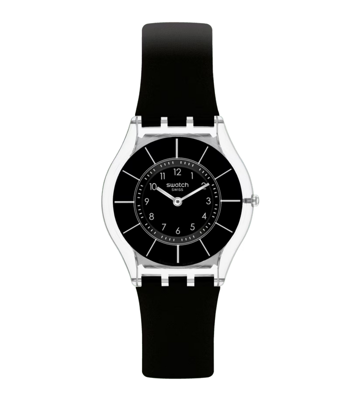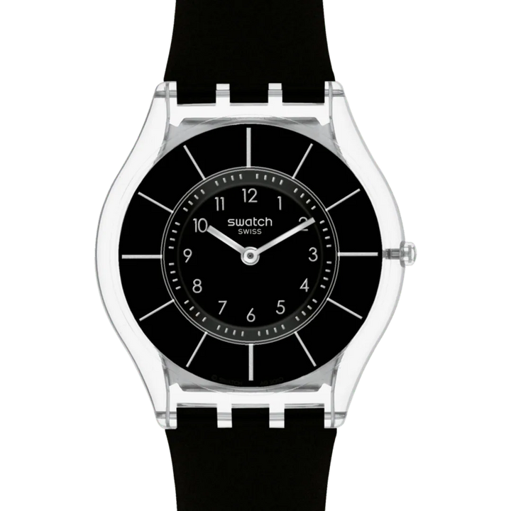BLACK CLASSINESS (SS08K103) este un ceas elegant, cu o curea subtire din silicon negru si o carcasa transparenta din polimer. Cadranul complet negru, accentuat de indicatoare argintii, defineste rafinamentul prin simplitatea si contrastul sau modern.