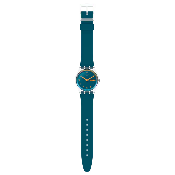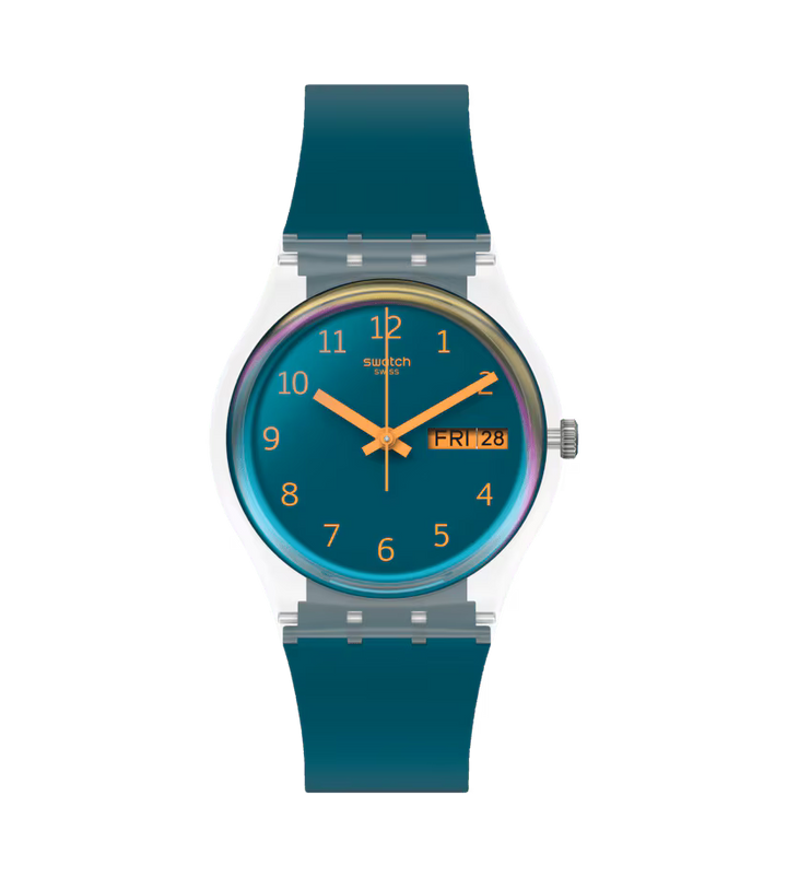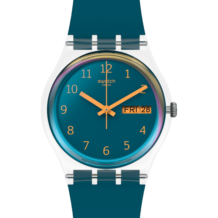 BLUE AWAY (SO28K700) are o curea in nuante de teal inchis, iar cadranul asortat este protejat de sticla hipnotica Swatch Solar Spectrum. Limbile portocalii indica ora, iar fereastra pentru zi si data, tot portocalie, este amplasata la ora 3.