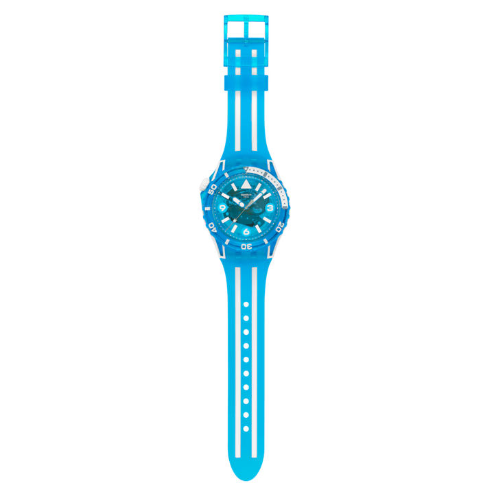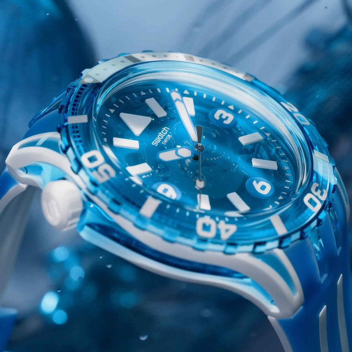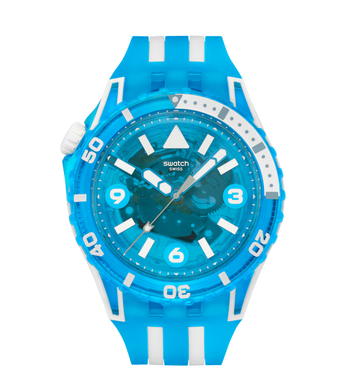 Cadranul albastru transparent al acestui ceas de scufundare prezinta indici si cifre albe imprimate, ace albastre pentru ore si minute si o secundara gri, toate cu efect luminos, sub sticla biosursata. Carcasa combina Bioceramic alb mat cu material biosursat albastru transparent lucios si este completata de o luneta albastra transparenta biosursata, lucioasa, cu imprimeu gri si alb care lumineaza in intuneric si o coroana Bioceramic alba mata la ora 10. Cureaua alba mata si albastra transparenta mata, impreuna cu o bucla albastra transparenta mata si o catarama biosursata albastra transparenta lucioasa, completeaza ceasul.