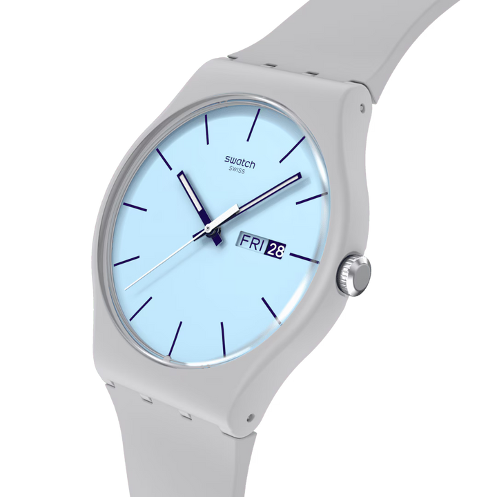 Cadranul albastru deschis al acestui ceas are indici imprimați mov închis și o fereastră zi-dată la ora 3. Limbile orară și minutară mov închis cu efect fosforescent și limba secundară albă indică ora sub geamul biosursat. O carcasă gri deschis mat biosursată, cu curea, buclă și închizătoare asortate, completează ceasul.