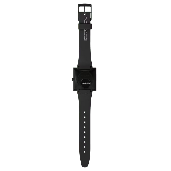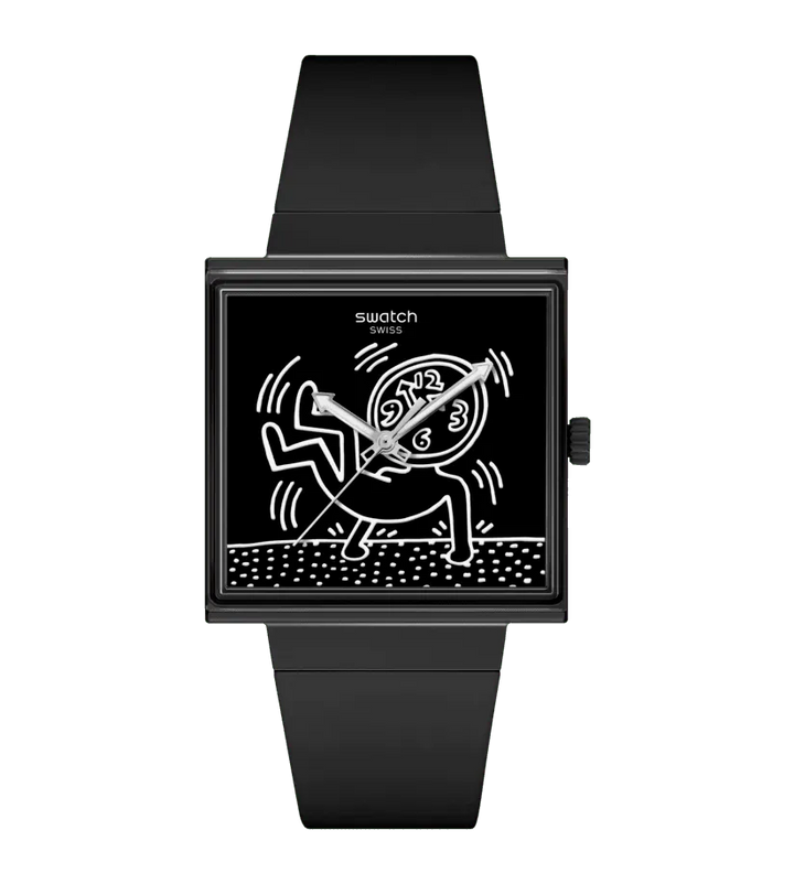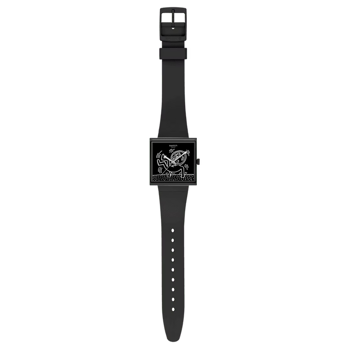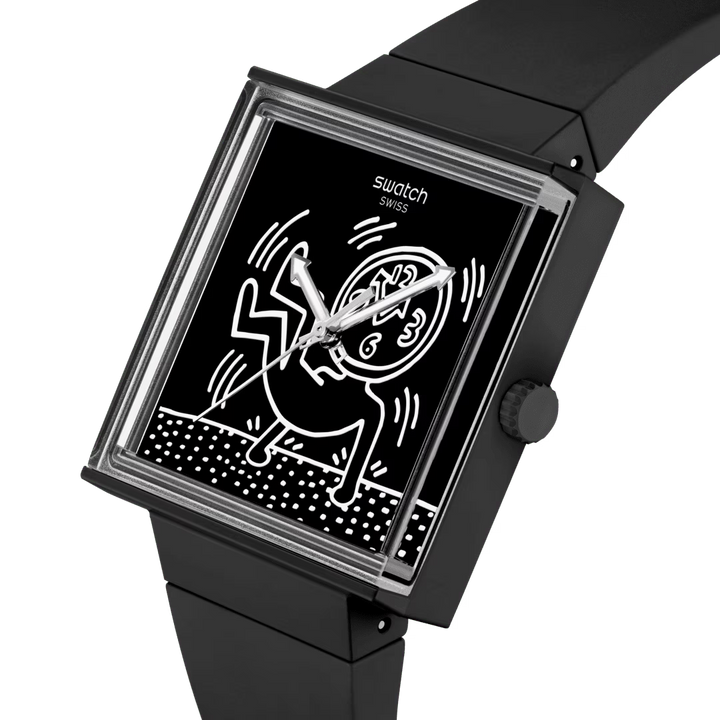 Carcasa pătrată din BIOCERAMIC negru mat are un geam biosursă cu margini până la extremități, care oferă o vedere laterală a designului alb imprimat pe cadran. Cadranul pătrat negru are indicatoare argintii, în formă de săgeată, pentru ore și minute, care luminează în întuneric, și un indicator de secunde argintiu. Cadranul și carcasa sunt completate de o curea integrată neagră mată, din material biosursă, cu un loop asortat și o cataramă din BIOCERAMIC. Capacul negru mat al bateriei, cu imprimeu alb pe spate, prezintă un logo Swatch desenat de Keith Haring.