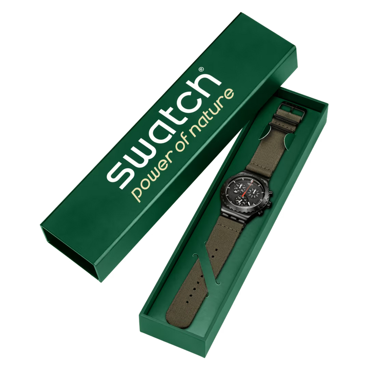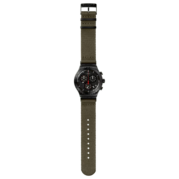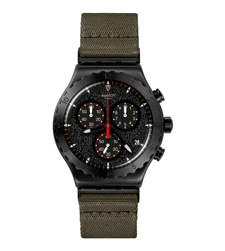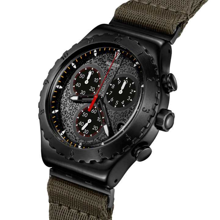 Acest cronograf din otel inoxidabil are un cadran negru cu detalii 3D inovatoare, imprimeu alb si rosu si indexuri si ace care lumineaza in intuneric. Are o luneta si o carcasa din otel inoxidabil periat cu PVD negru. O curea din material textil kaki, bucle din otel inoxidabil cu PVD negru si o catarama jumatate din otel inoxidabil completeaza ceasul.