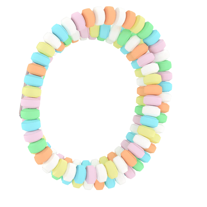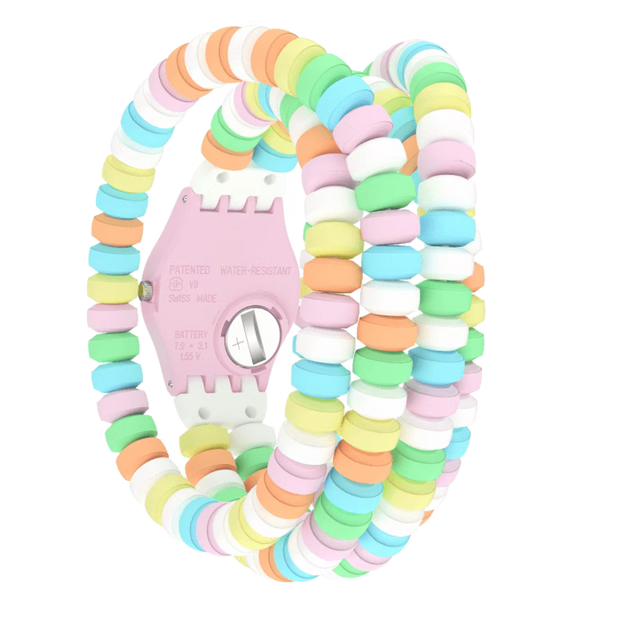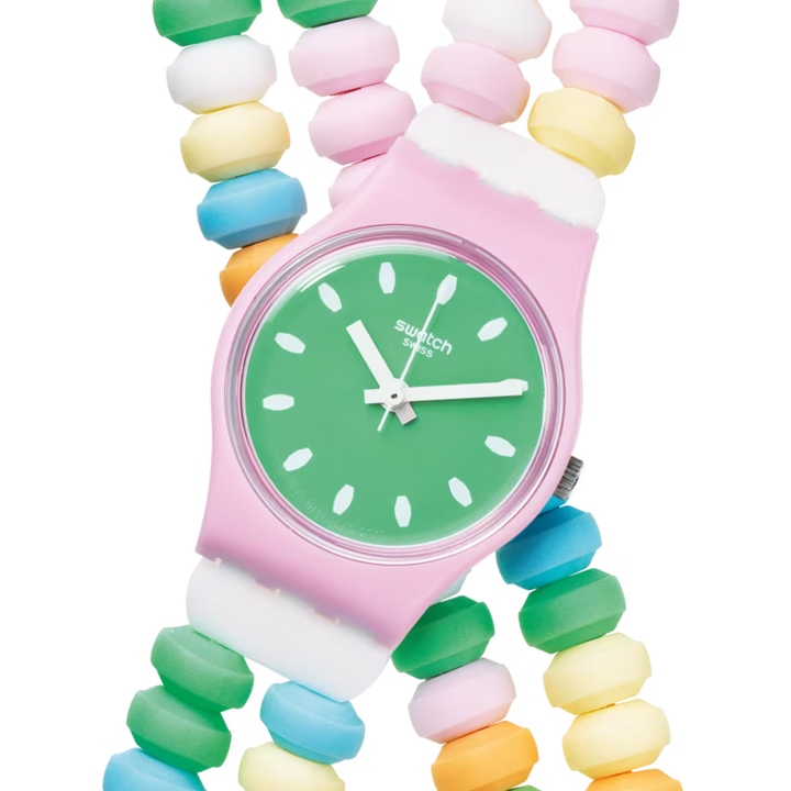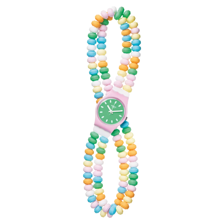 Acest ceas vesel are un cadran verde cu indicatoare albe pentru ore, minute si secunde, precum si marcaje albe imprimate, toate incadrate intr-o carcasa roz deschis. Cureaua dubla, in stil “candy”, este formata din zale multicolore, completand perfect aspectul jucaus.