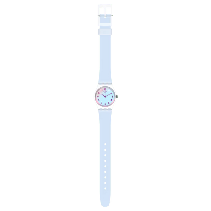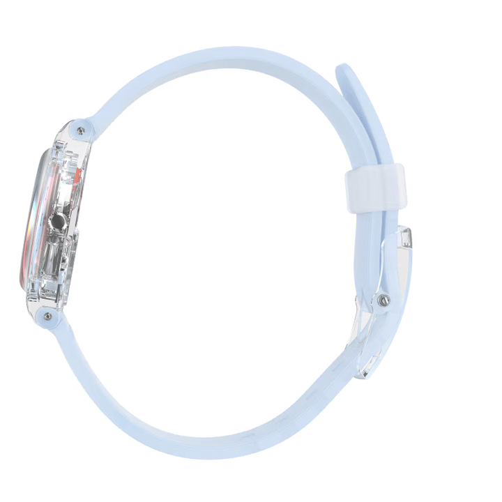 CASUAL BLUE (LK396) impresioneaza prin eleganta sa, cu un geam Swatch Solar Spectrum care reflecta nuantele reci de albastru ale curelei transparente.