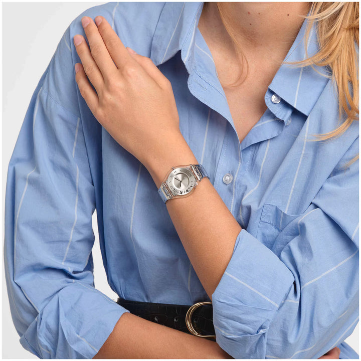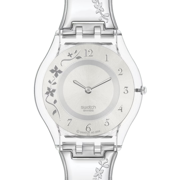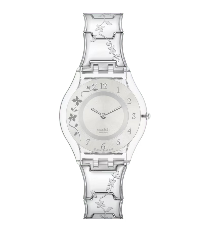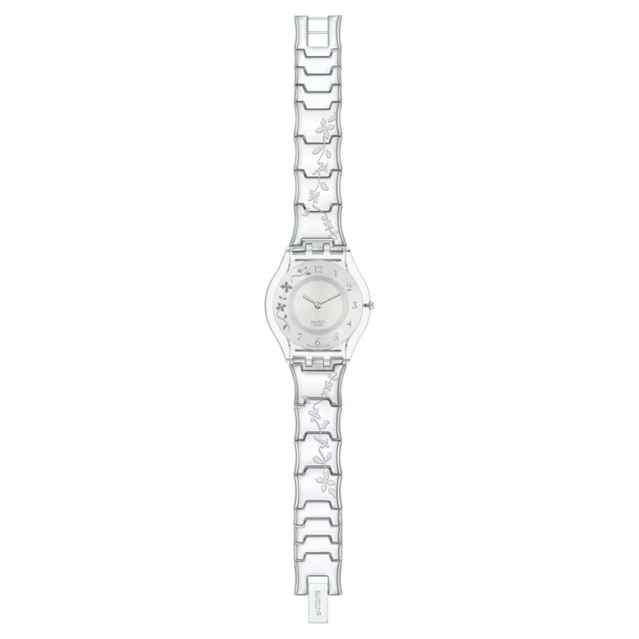 CLIMBER FLOWERY (SS08K100G) emană eleganță prin motivul floral gravat din oțel, care se întinde delicat pe verigile arcuite ale brățării din oțel inoxidabil. Cadranul argintiu cu finisaj satinat este decorat cu flori metalice aplicate și cifre arabe lustruite, oferind un aspect rafinat și feminin. Carcasa transparentă din polimer completează designul ușor și sofisticat, iar limbile subțiri, rotunjite, marchează timpul cu finețe.