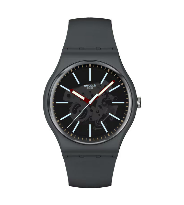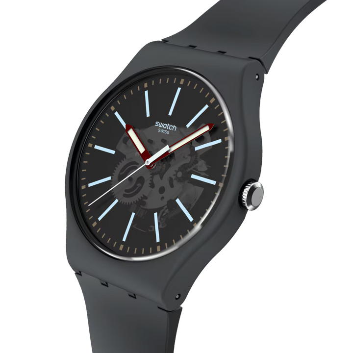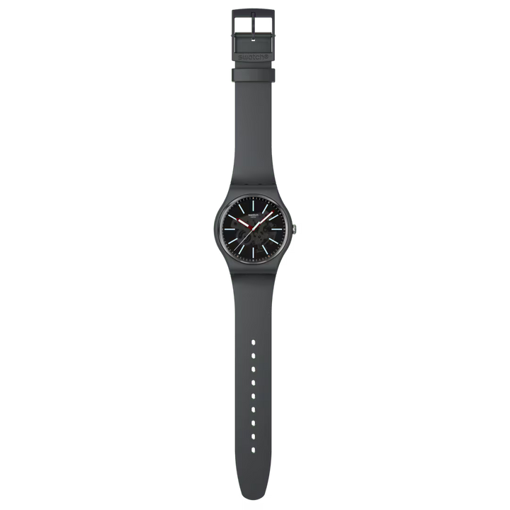 Cadranul gri închis transparent al acestui ceas oferă o vedere asupra mecanismului și include indici albastru deschis și un marcaj bej al minutelor. Limbile de oră și minut burgund, cu efect fosforescent, și secundarul albastru deschis indică ora sub geamul biosursat. O carcasă gri închis mat, biosursată, împreună cu o curea, o buclă și o cataramă asortate, completează ceasul.