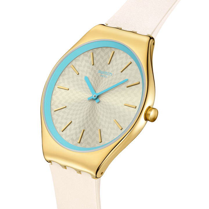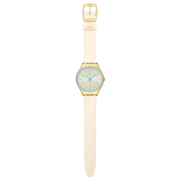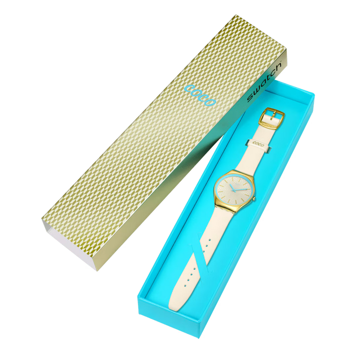 Acest ceas elegant este creat in colaborare cu sportiva Swatch Proteam, Coco Ho. Prezinta un cadran ivoire cu finisaj periat, indici aplicati aurii, imprimeu turcoaz si ace turcoaz pentru ore si minute. Este completat de o carcasa din otel inoxidabil cu acoperire PVD aurie. Cureaua mata ivoire, cu efect Anodamazing, are o bucla asortata cu imprimeu auriu si o catarama din otel inoxidabil cu acoperire PVD aurie.