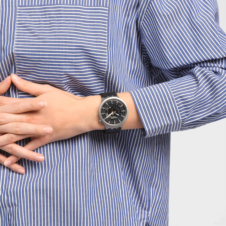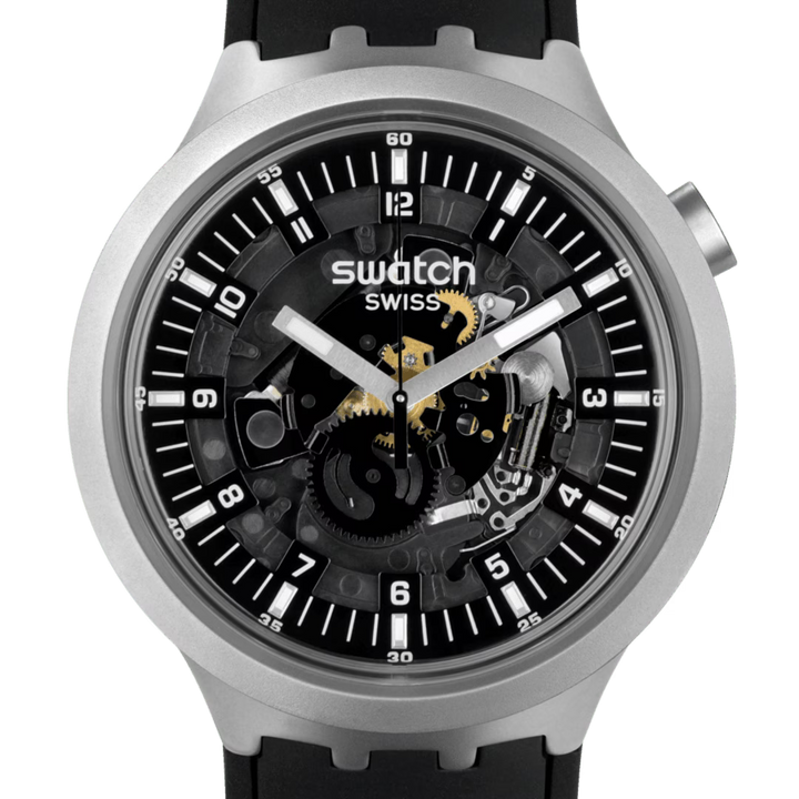 Acest ceas supradimensionat are un cadran negru deschis, cu limbi fosforescente, intr-o carcasa metalica cu finisaj sablat. Un model negru cu cadran mare, completat de o curea rezistenta, texturata, prevazuta cu doua bucle.