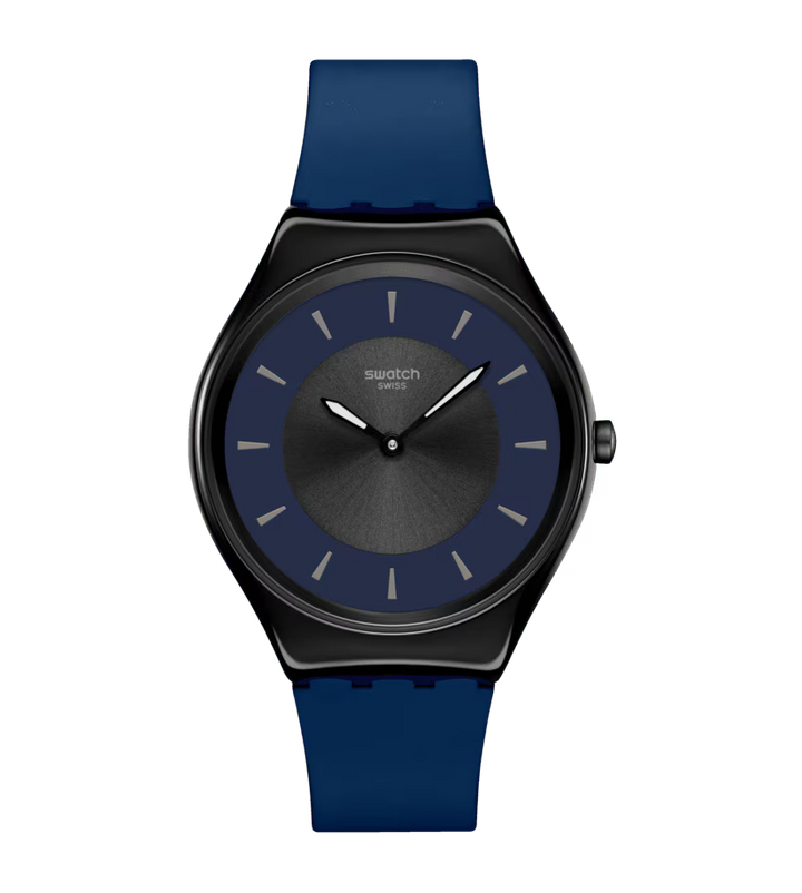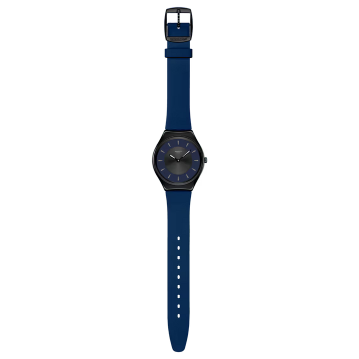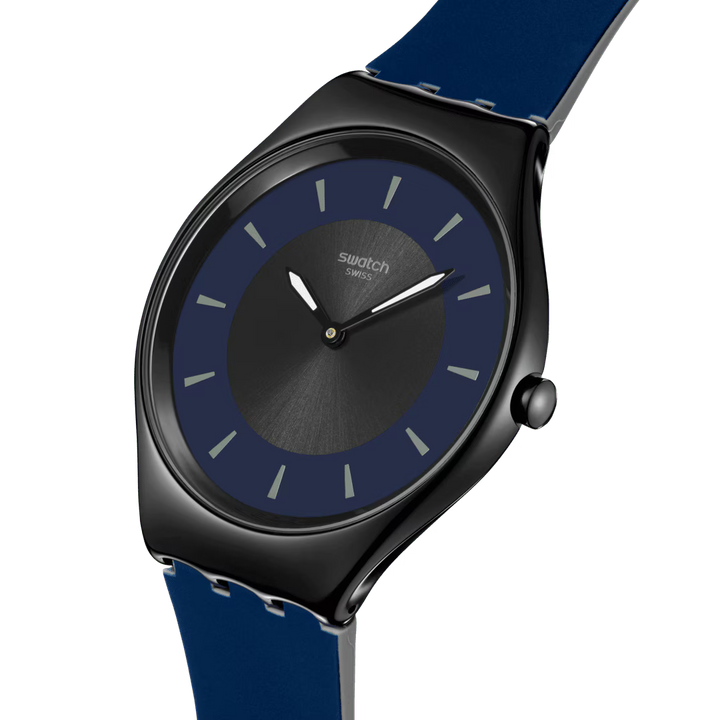Acest ceas ultra-subțire are un cadran negru cu finisaj periat de soare, un inel exterior imprimat albastru închis, marcaje orare gri imprimate și indicatoare negre pentru ore și minute cu efect fosforescent. Carcasa și catarama din oțel inoxidabil lucios au un strat de acoperire PVD negru și sunt completate de o curea mată albastru închis, cu interior gri mat și cu o buclă mată albastru închis.