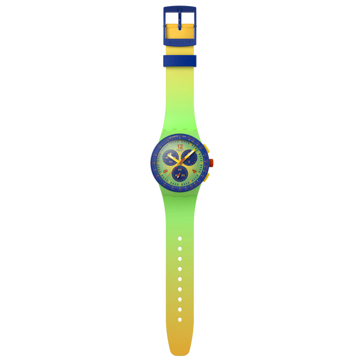 Acest cronograf are un cadran cu gradient galben si verde deschis, cu imprimeu multicolor, indicatoare galbene pentru ore si minute care stralucesc in intuneric si un indicator rosu pentru secunde. Carcasa verde deschis mata are o rama albastra mata cu scala tahimetrica imprimata cu rosu si galben, butoane galbene mate si o coroana rosie. O curea mata cu gradient verde deschis si galben, o bucla albastra mata si o catarama albastra mata completeaza ceasul.