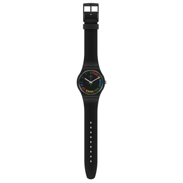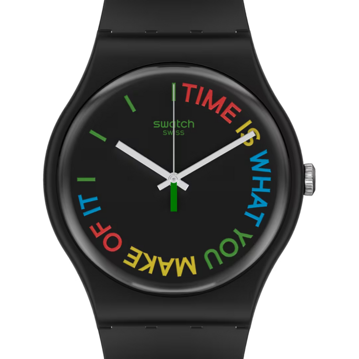 Mesajul se inspira din anul 1984, de la expresia „don’t be too late”, primul mesaj ironic si nonconformist imprimat vreodata pe un Swatch. Are trei versiuni diferite: „same same but different” pe stilul Gent (observa diferenta... o schimbare de culoare), „call to action” pe noul stil Gent si „tell me more” ca model decorativ pe mecanismul Sistem51 (disponibil in octombrie). Este imposibil de trecut cu vederea – si poate fi ales in functie de stilul personal. Iar, desigur, cea mai potrivita notiune a timpului: fiecare ceas poarta numele cuvantului TIME in una dintre numeroasele limbi ale lumii.