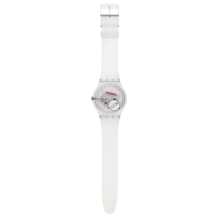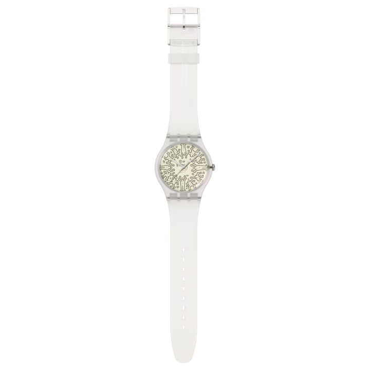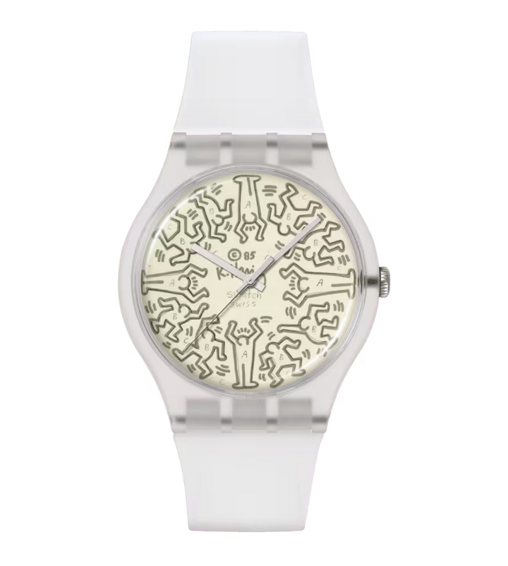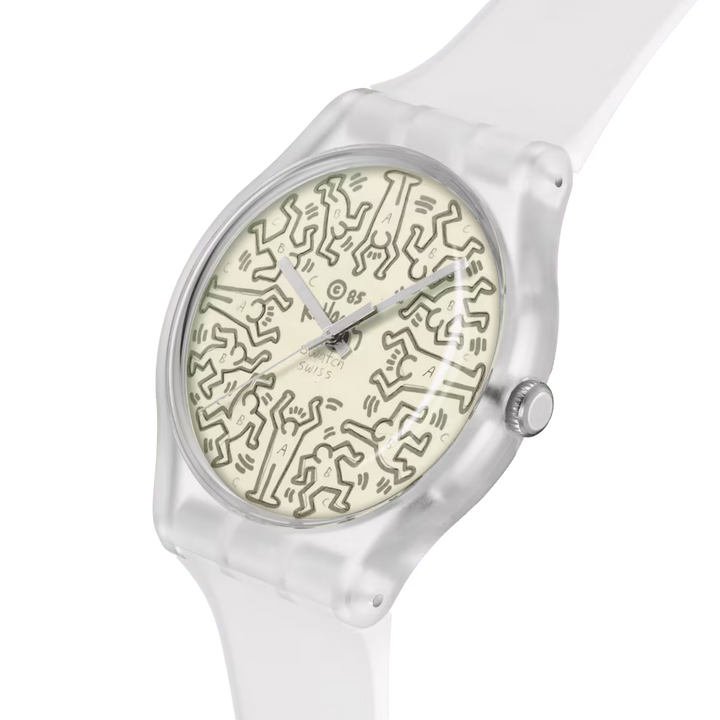 Cadranul bej deschis mat al acestui ceas prezintă desene gri, semnătura și drepturile de autor ale artistului Keith Haring, precum și interpretarea artistului a logo-ului Swatch. Acul orar, minutarul și secundarul de culoare argintie indică ora sub geamul biosursat. O carcasă mată transparentă biosursată și o curea, buclă și cataramă transparente mate completează ceasul.