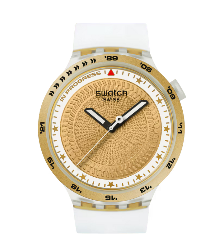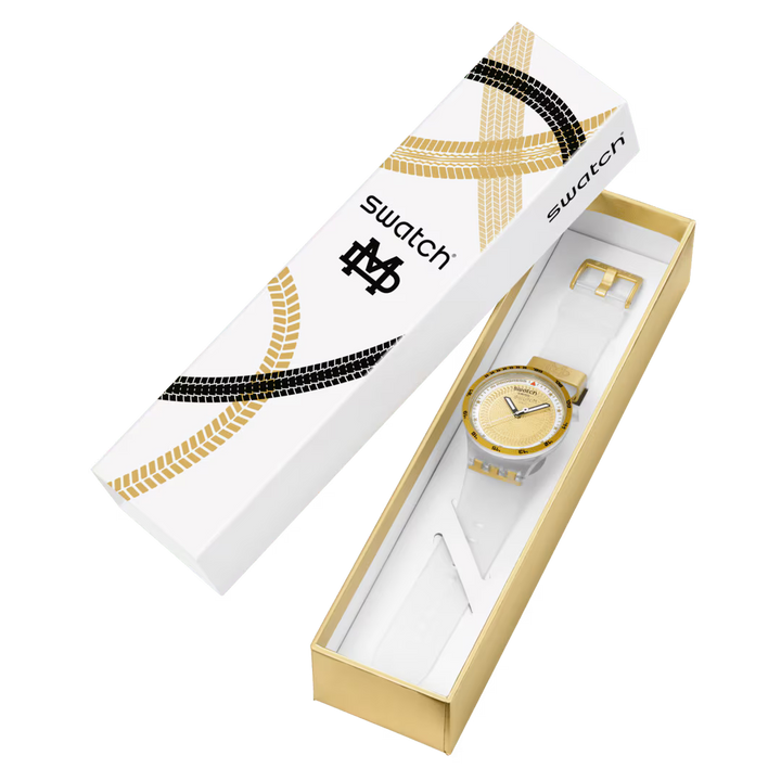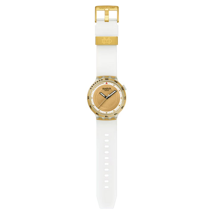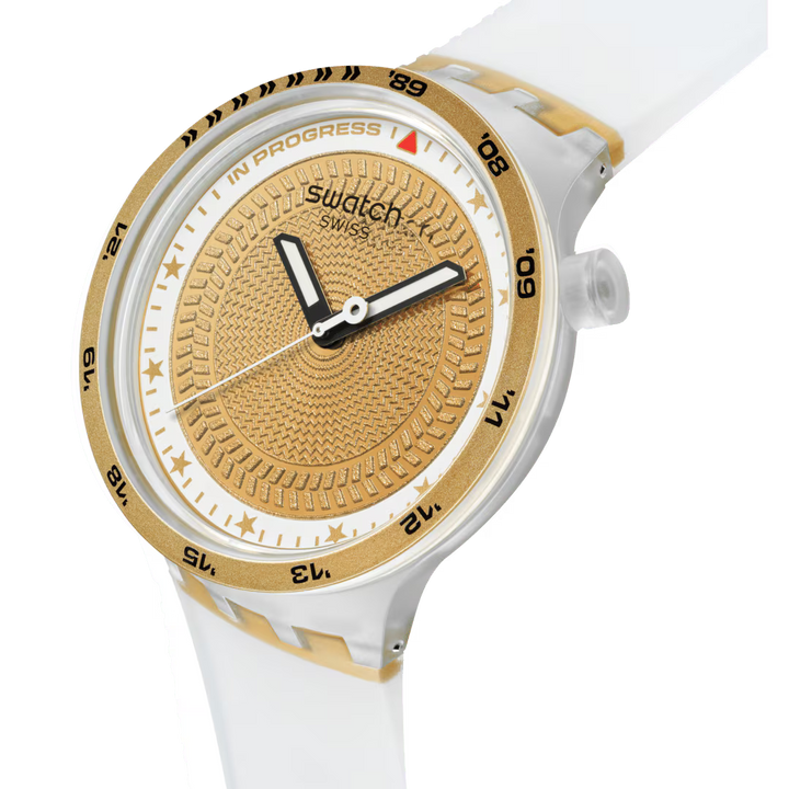 Acest ceas sport supradimensionat este creat în colaborare cu atletul Swatch Proteam Matthias Dandois. Are un cadran texturat, auriu, cu imprimeu multicolor, detalii fosforescente, ace pentru ore și minute negre, care strălucesc în întuneric, și o secundară albă. Carcasa mată, transparentă, biosursată, cu geam biosursat, este evidențiată de o ramă mată, transparentă, biosursată, cu imprimeu multicolor. Cureaua mată, transparentă, cu inserție aurie mată, are bucle mate, transparente și aurii, și o cataramă jumătate aurie, mată.