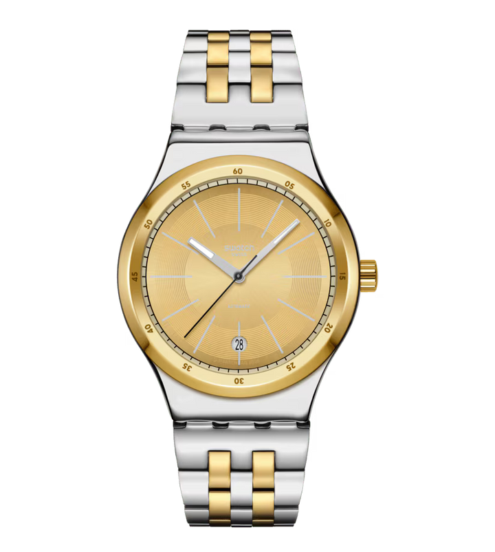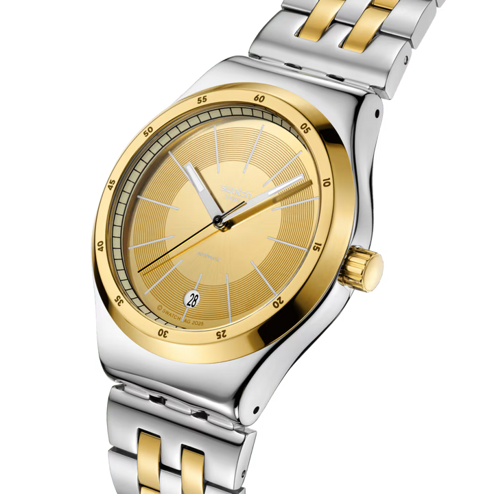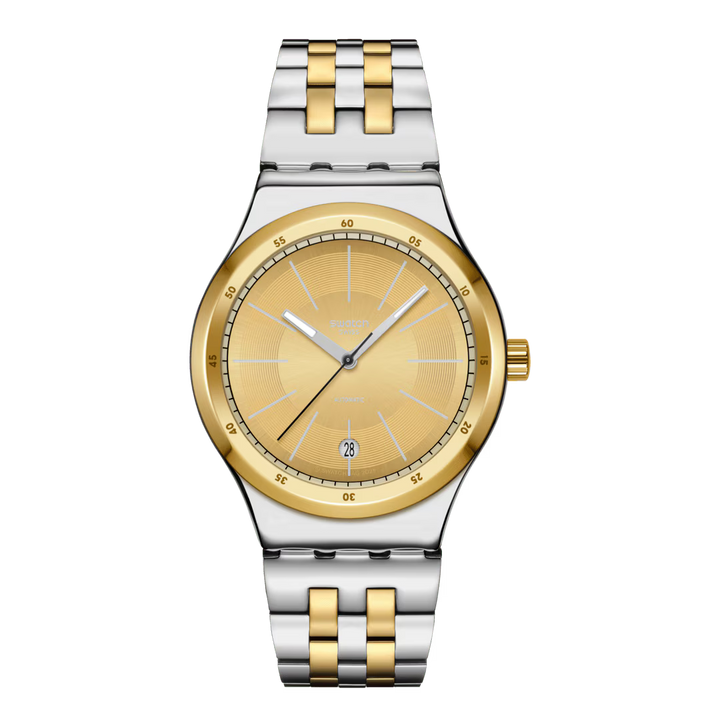 Acest ceas automat are un cadran auriu cu marcaje orare albe imprimate, o margine interioara ivoire cu marcaje pentru minute imprimate cu negru si o fereastra pentru data la ora 6. Limbile argintii pentru ore si minute lumineaza in intuneric, iar secundarul negru indica timpul. Carcasa din otel inoxidabil polisat permite vizualizarea mecanismului pe spate si este completata de o luneta din otel inoxidabil polisat cu finisaj PVD auriu si cifre gravate. Bratara din otel inoxidabil polisat, cu PVD auriu pe verigile interioare si cu inchidere tip fluture, completeaza aspectul.