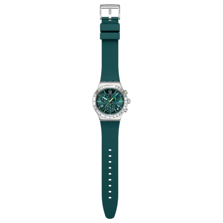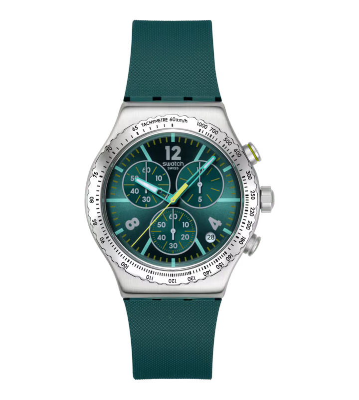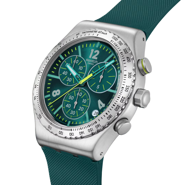 Acest cronograf are un cadran verde teal cu finisare periată de tip sun-brushed, cifre albe imprimate, marcaje orare imprimate in turcoaz, scala minutelor imprimata in galben, subcadrane verde inchis cu imprimare galbena si alba si o fereastra pentru data intre orele 4 si 5. Acele orare si de minute turcoaz lumineaza in intuneric, iar acul galben al secundelor cronografului indica timpul. Carcasa din otel inoxidabil periat este completata de o luneta din otel inoxidabil polisat, cu tahimetru gravat in negru, o curea verde inchis cu textura mata, bucle verde inchis mate si o catarama jumatate din otel inoxidabil periat.