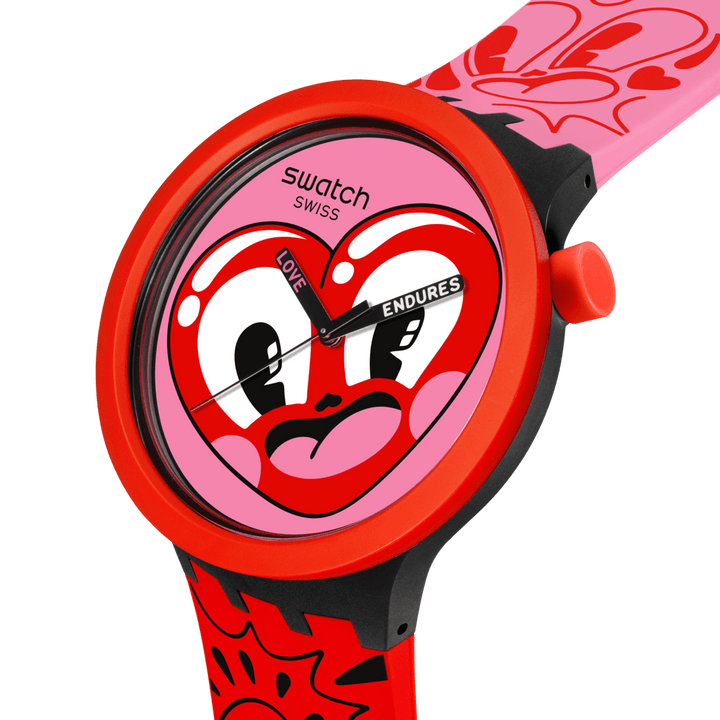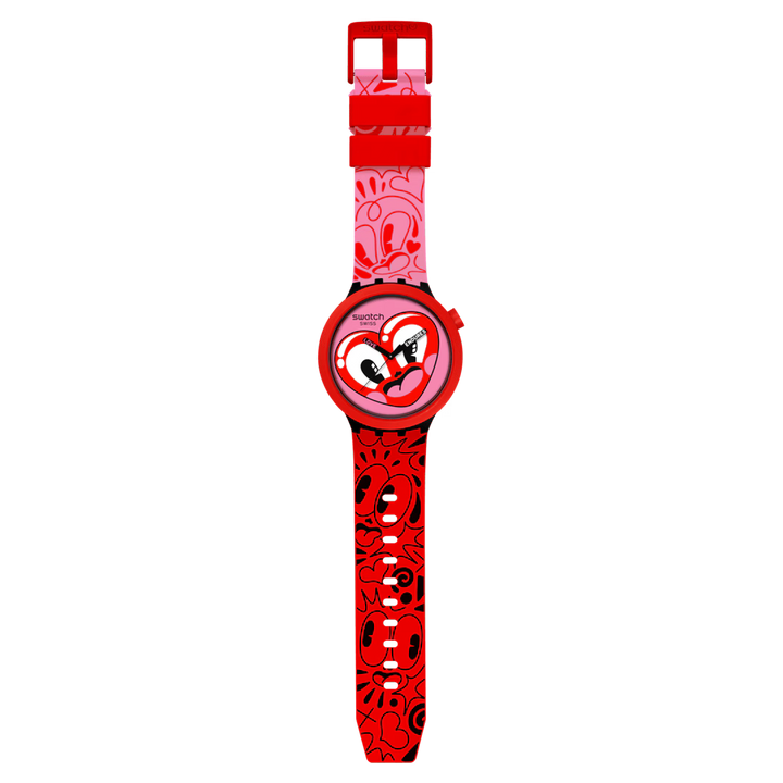 Ceasul acesta amuzant, de dimensiuni mari, a fost creat în colaborare cu artista și ilustratoarea Hattie Stewart. Cadranul roz prezintă un imprimeu multicolor, o oră neagră cu imprimeu roz, un minut negru cu imprimeu alb și o secundă neagră, toate sub sticlă biosursată. Carcasa neagră mată și bezelul și butonul roșu mat sunt realizate din material biosursat. Cureaua superioară este roz mat cu imprimeu roșu și are două bucle roșii mate și o închizătoare pe jumătate, iar cureaua inferioară este roșu mat cu imprimeu negru.