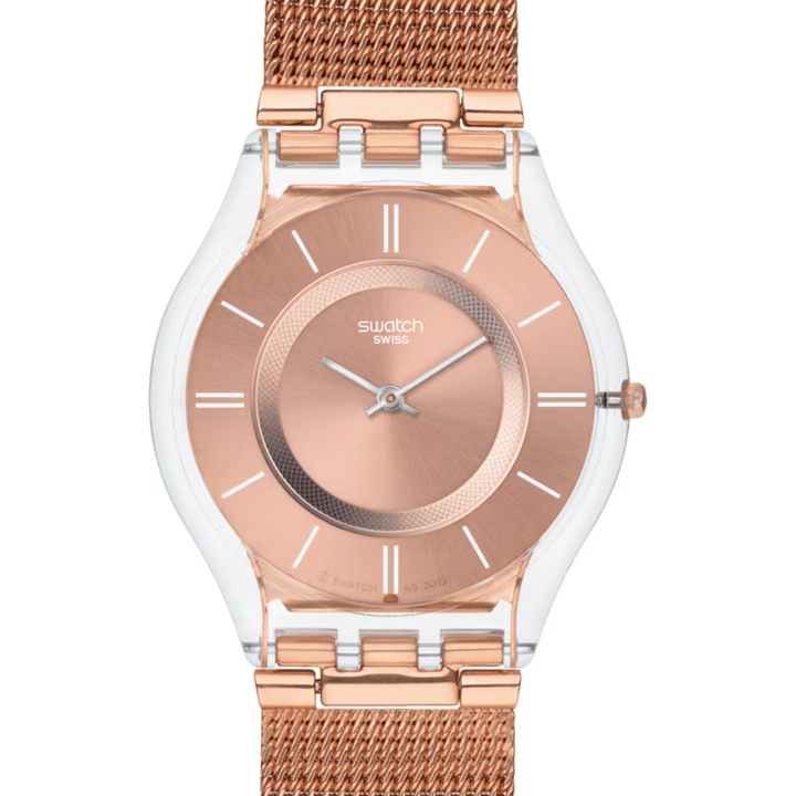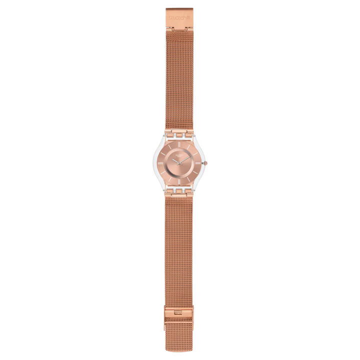 HELLO DARLING (SS08K104M) impresionează prin eleganța cadranului roz-auriu satinat, completat de indicatoare albe și limbile argintii. Carcasa transparentă din material biosursat și sticla biosursată oferă un aspect modern și sustenabil. Brățara fină din plasă de oțel inoxidabil, acoperită cu un strat PVD roz-auriu reglabil, desăvârșește designul subțire și rafinat al acestui ceas sofisticat.
