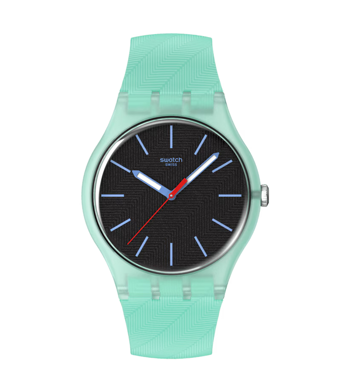 Acest ceas are un cadran negru texturat cu marcaje orare imprimate in albastru deschis, acele de ora si de minut in albastru deschis cu efect fosforescent si o secunda rosie intr-o caracasa verde deschis mata si transparenta, realizata din material biosursat, cu sticla biosursata. o curea verde deschis mata, texturata, cu un inel verde deschis mat si o catarama verde deschis mata si transparenta completeaza ceasul.