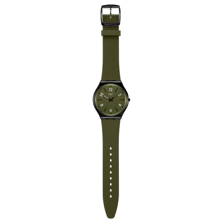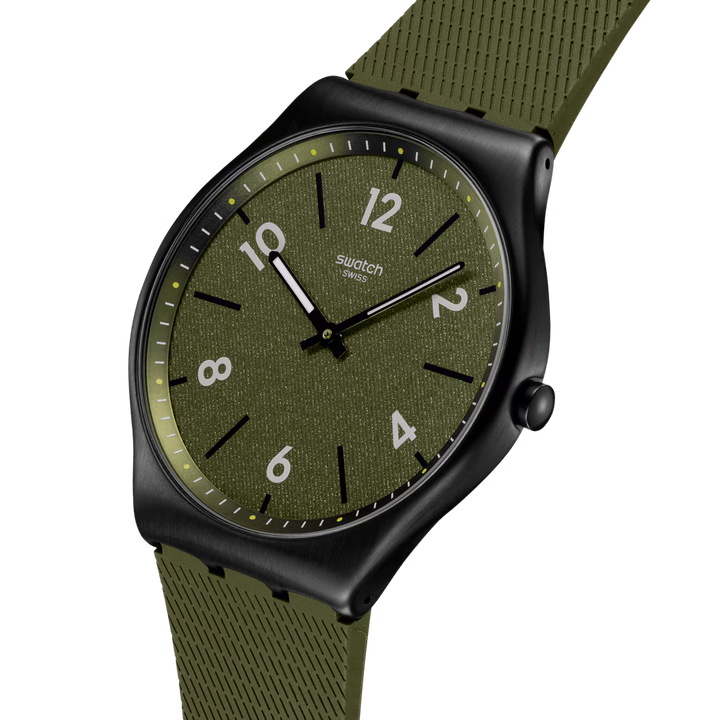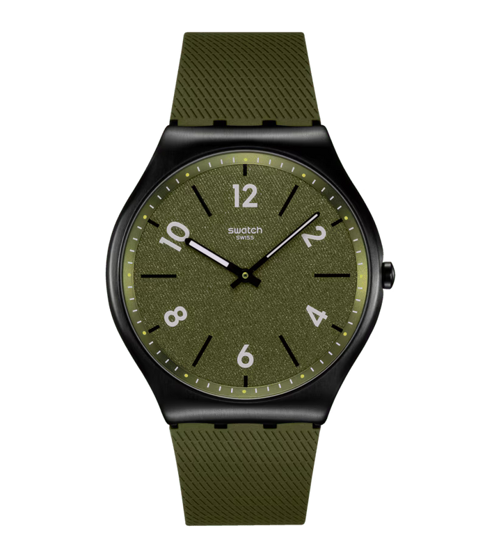 Acest ceas ultra-subtil are un cadran verde inchis cu cifre imprimate albe, marcaje ale orelor imprimate cu negru, o flansa verde inchis cu marcaj al minutelor imprimat in alb si verde, precum si ace negre pentru ore si minute care lumineaza in intuneric. Carcasa din otel inoxidabil periat cu PVD negru este completata de o catarama asortata si o curea texturata, mata, verde inchis, cu un loop verde inchis mat.