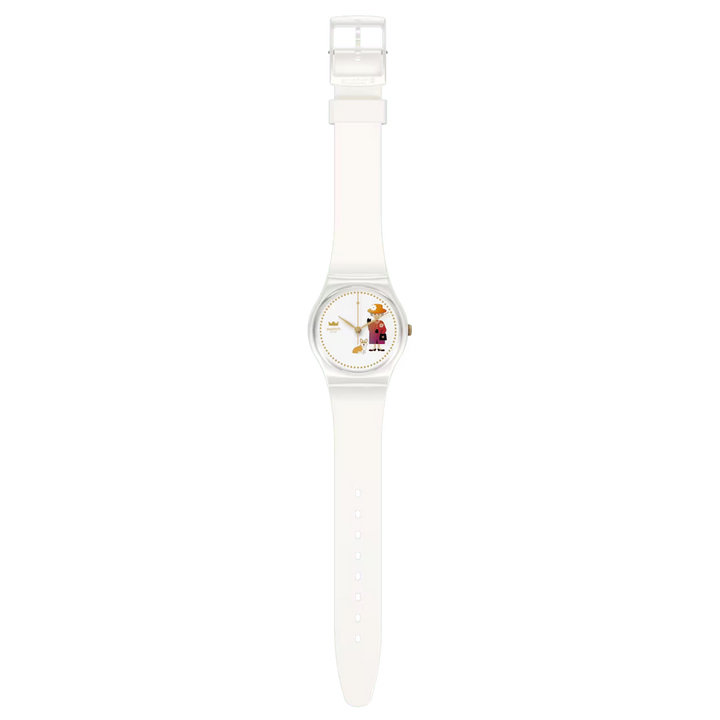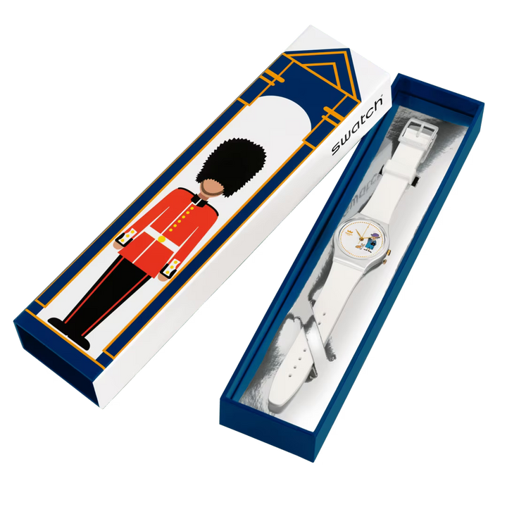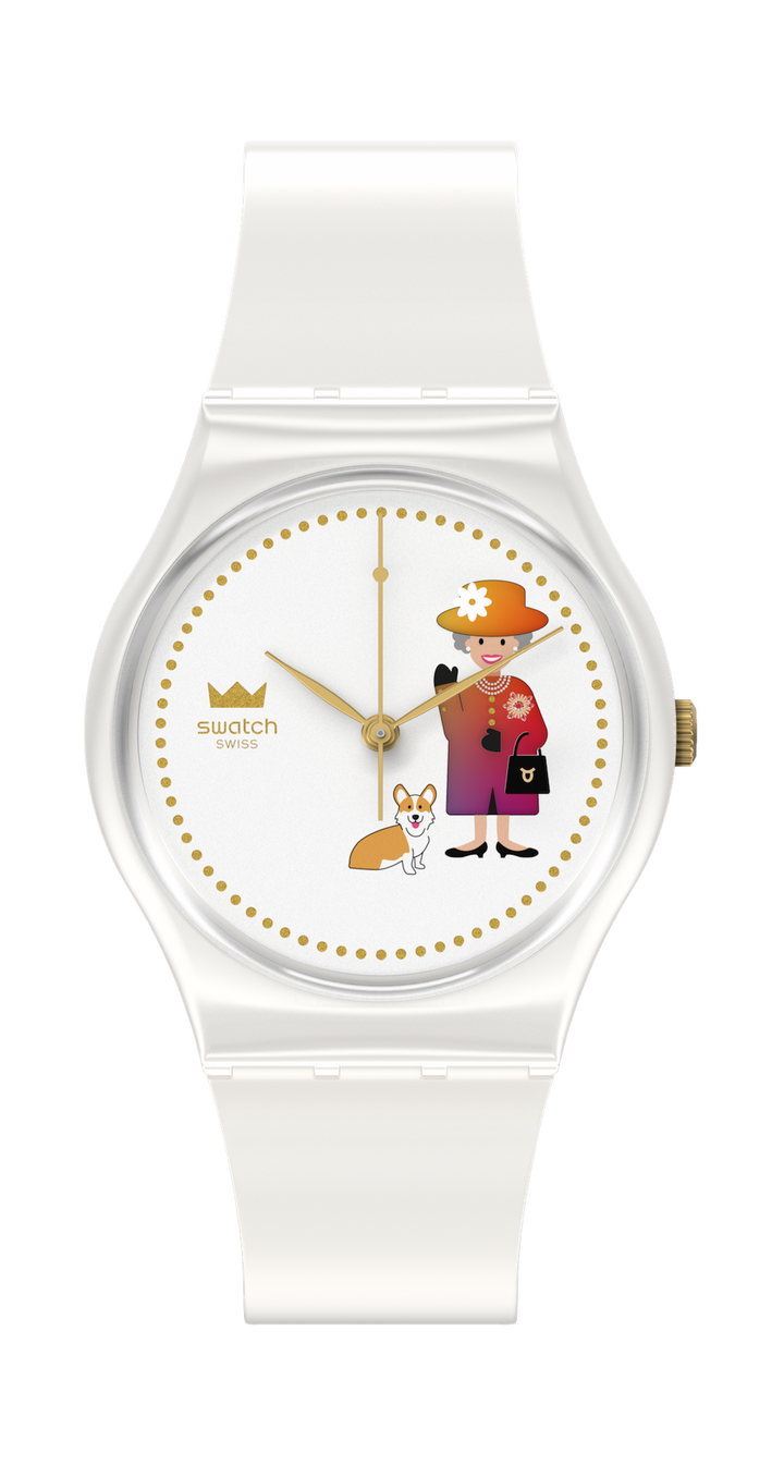 Cu un cadran transparent cu imprimeu alb si auriu, acest model Gent sarbatoreste cei 70 de ani de domnie ai Reginei, avand 70 de puncte aurii pe margine. Elementul central este discul calendarului care isi schimba culoarea, modificand zilnic tinuta Reginei. Carcasa alba mata si cureaua din silicon cu efect Anodamazing completeaza designul elegant. In ambalajul special se afla o surpriza: o coroana din hartie argintie stralucitoare.
