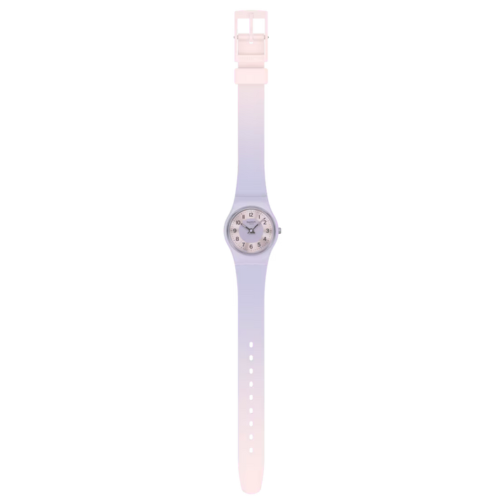 Acest ceas mic are un cadran roz cu finisaj periat de soare, un punct interior imprimat mov deschis si cifre imprimate verde inchis, plus marcajele minutelor. Are ace pentru ore si minute verde inchis cu efect fosforescent si un secundar mov deschis care indica ora. Carcasa mov deschis mata este combinata cu o curea mata in gradient mov deschis si roz deschis si cu o bucla si catarama roz deschis mate.