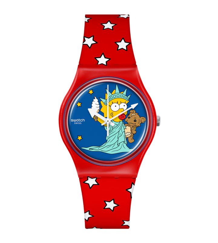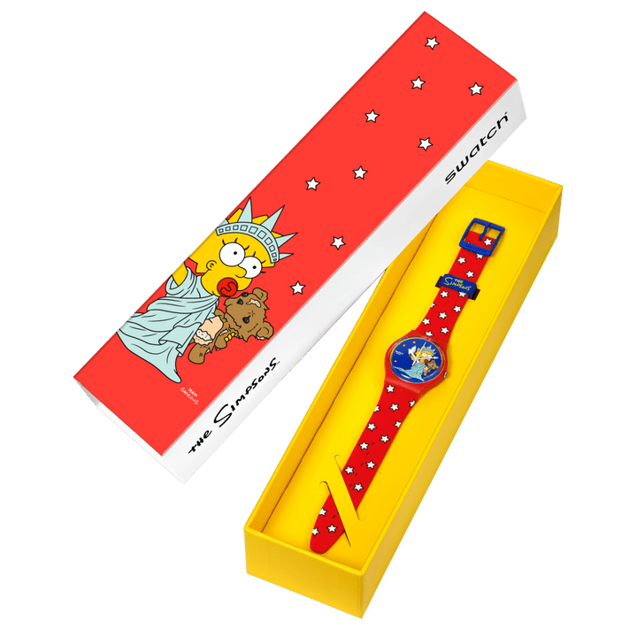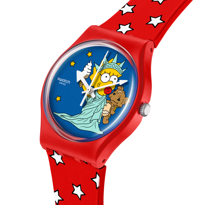 Parte din colectia The Simpsons, acest ceas jucaus sarbatoreste 4 iulie cu Maggie in rol de Doamna Libertatii pe cadran. Are o carcasa rosie mata din materiale biosursate, cu sticla biosursata, o curea rosie mata cu stelute albastre si albe, un loop albastru inchis cu logo-ul The Simpsons si o catarama albastru inchis.