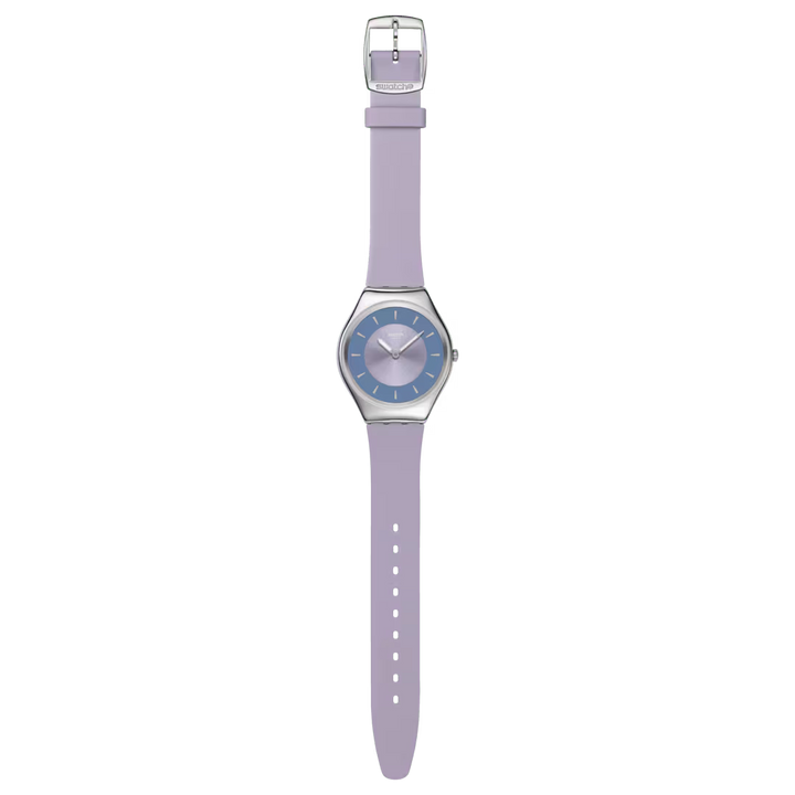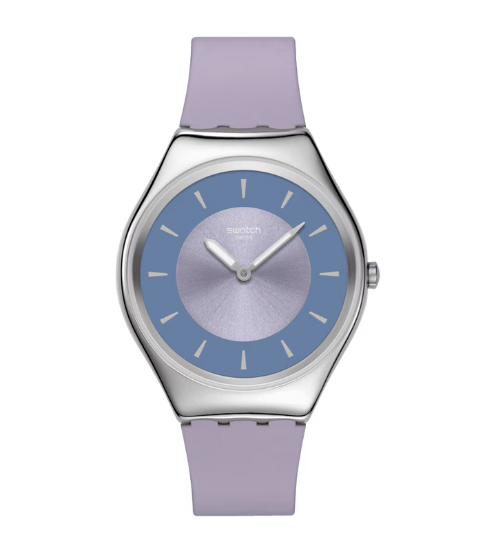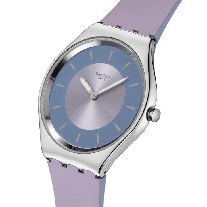 Aceasul ultra-subtire LYRICALY LAVENDER are un cadran lila deschis, cu finisaj sun-brushed si un inel exterior imprimat in nuante de mov. Marcajele orare bej si limbile argintii pentru ora si minute beneficiaza de efect glow-in-the-dark. Carcasa si catarama din otel inoxidabil lucios sunt completate de o curea mov deschis, mata, cu interior mov mat si un loop asortat.