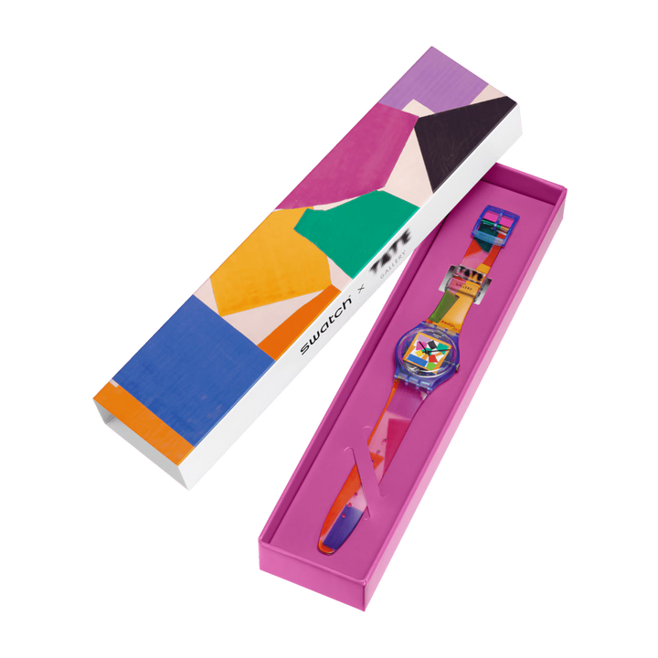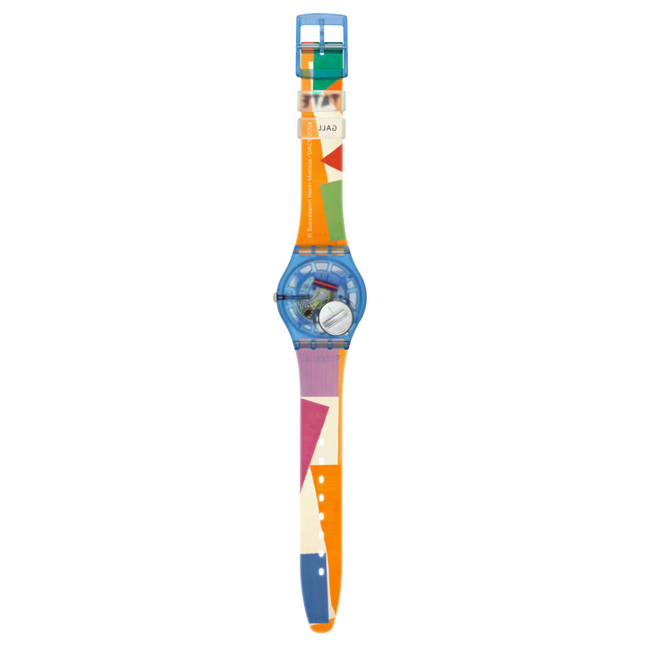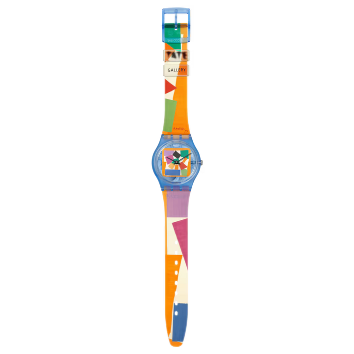 Ceasul din colecția Swatch x Tate Gallery are o carcasă transparentă, mată, albastră, din materiale bio-sursate și geam bio-sursat. Cadranul prezintă integral lucrarea „The Snail” de Henri Matisse și are ace negre pentru ore și minute. Cureaua transparentă și lucioasă are imprimată lucrarea și semnătura artistului. Bucla transparentă, lucioasă, este imprimată cu logo-ul Tate Gallery. Henri Matisse The Snail 1953. © Succession Henri Matisse/DACS 2024. Photo: Tate / © Tate