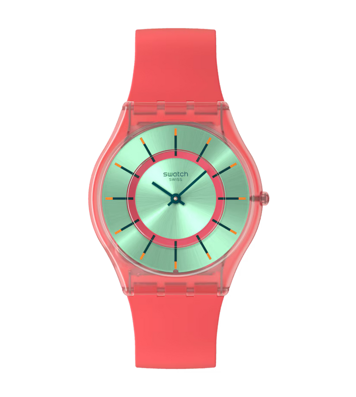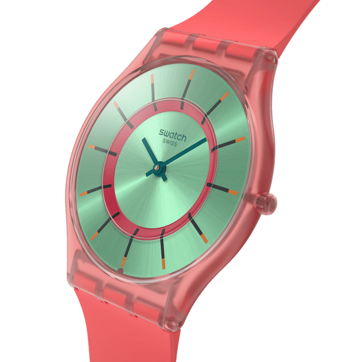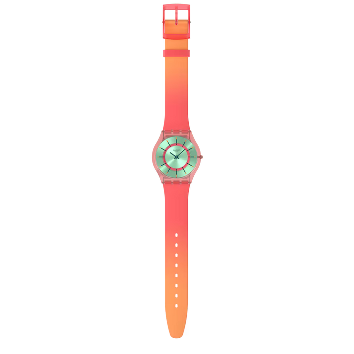 Acest ceas ultra-subtire are un cadran turcoaz cu finisaj satinat, cu un inel interior roz inchis imprimat, marcaje orare in două tonuri verde inchis si portocaliu si ace pentru ore si minute verde inchis, toate sub un geam biosursat. Carcasa roz transparent mata este asociata cu o curea mata in gradient roz inchis si portocaliu, o bucla roz inchis transparent mata si o catarama roz inchis transparent mata.