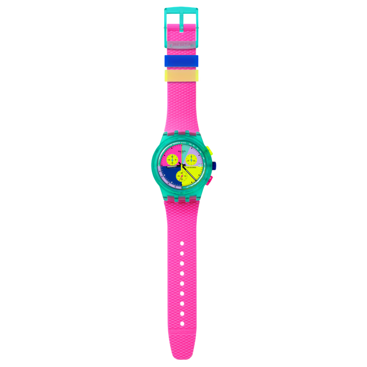Acest cronograf în culori neon este inspirat de Swatch CHRONO-ul anilor '90: FLASH ARROW (SCL100). Cadranul multicolor cu scala tahimetrica are ace de ora si minute negre, luminescente în întuneric, o secunda galbena si o fereastra pentru data la ora 3. Carcasa este verde mat transparent, cu o luneta asortata. Cureaua structurata roz este accentuata de bucle galbene si albastre mate transparente si de o catarama verde mata transparenta.