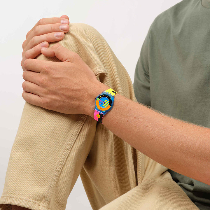 Acest ceas retro ultra-subtire este inspirat de un Swatch GENT din anii ’80: modelul colectibil FLUMOTIONS (GN102). Cadranul multicolor are o aratatoare neagra pentru ore si una roz pentru minute, intr-o caracasa albastra mata transparenta din material biosursat, cu sticla biosursata. Cureaua inferioara mata este galbena, iar cea superioara mata este roz, ambele cu imprimeu multicolor, completate de o bucla transparenta mata si o catarama galbena transparenta mata.