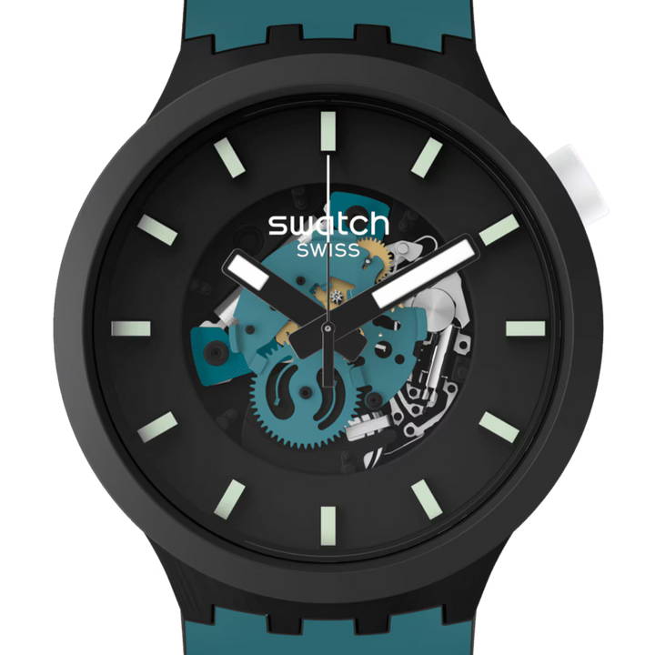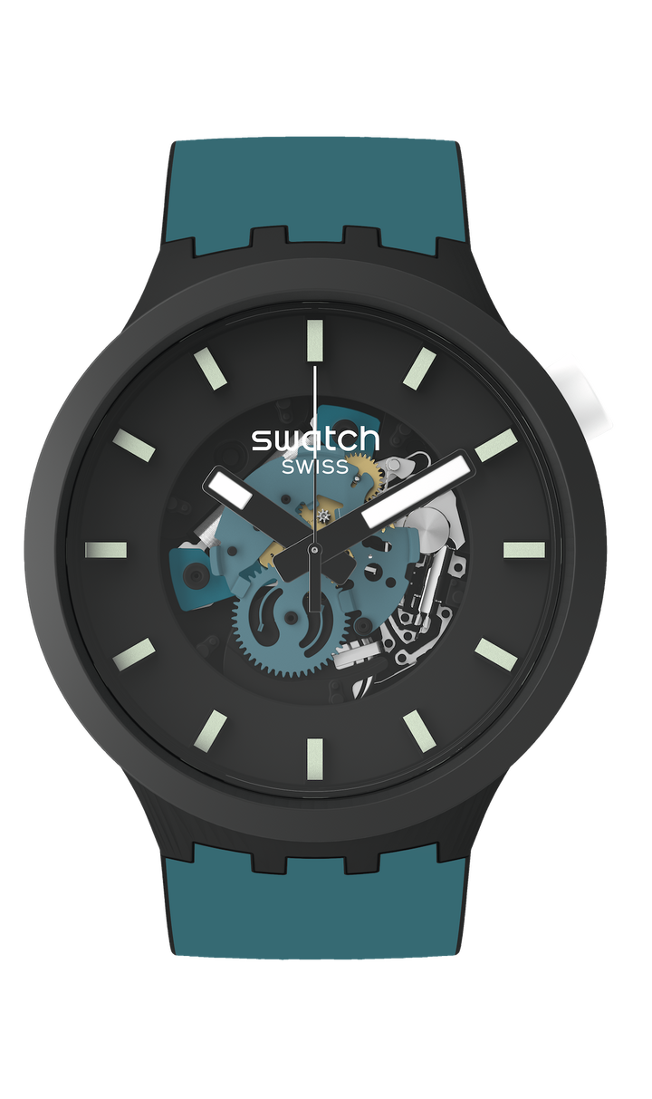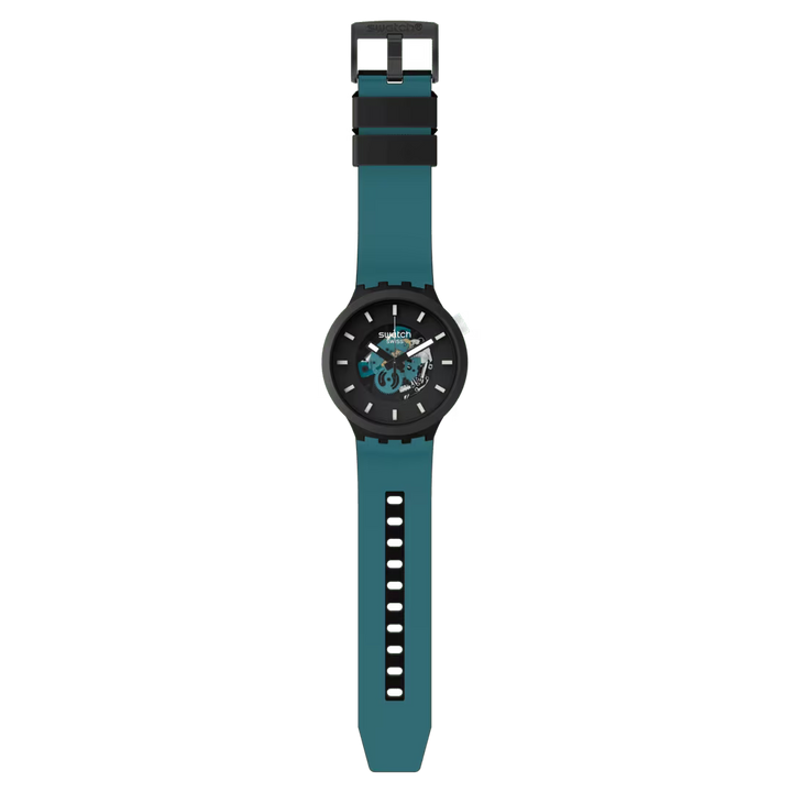 Elementul central al acestui ceas BIG BOLD BIOCERAMIC este cadranul de mari dimensiuni, cu un design decupat si efect 3D, protejat de un geam realizat din materiale bio-sursa. Negrul mat al carcasei si al bezelului din bioceramica, impreuna cu buclele din silicon, evidentiaza imprimeul albastru-inchis de pe cureaua din silicon a acestui model supradimensionat.