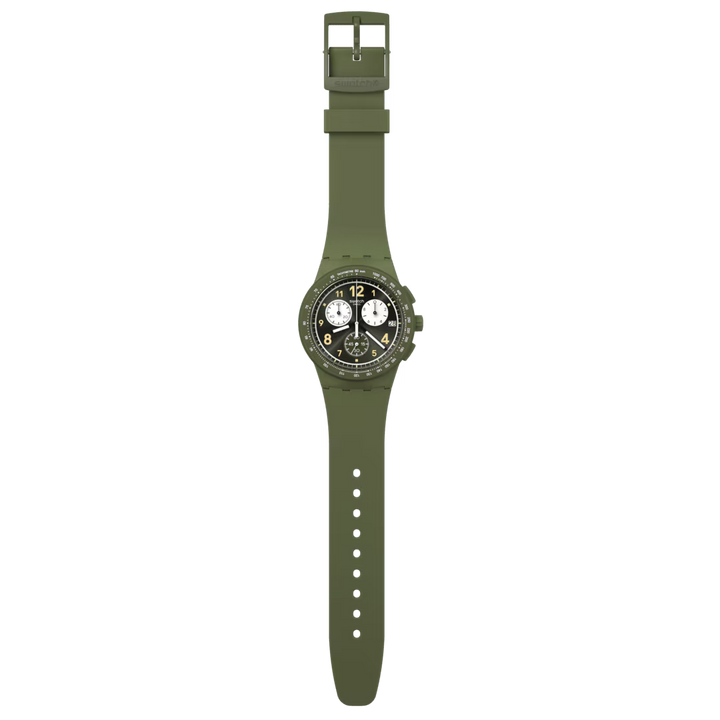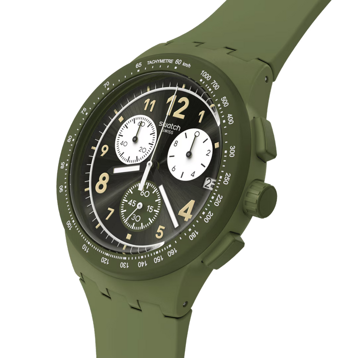 Acest cronograf verde kaki inchis are un cadran negru periat de soare, cu ace negre pentru ore si minute care lumineaza in intuneric, un secundar alb si o fereastra pentru data la ora 3. Acest ceas are o luneta verde cu inscriptionare alba, pe o caracasa verde mata, completata de o curea, o bucla si o prindere asortate.