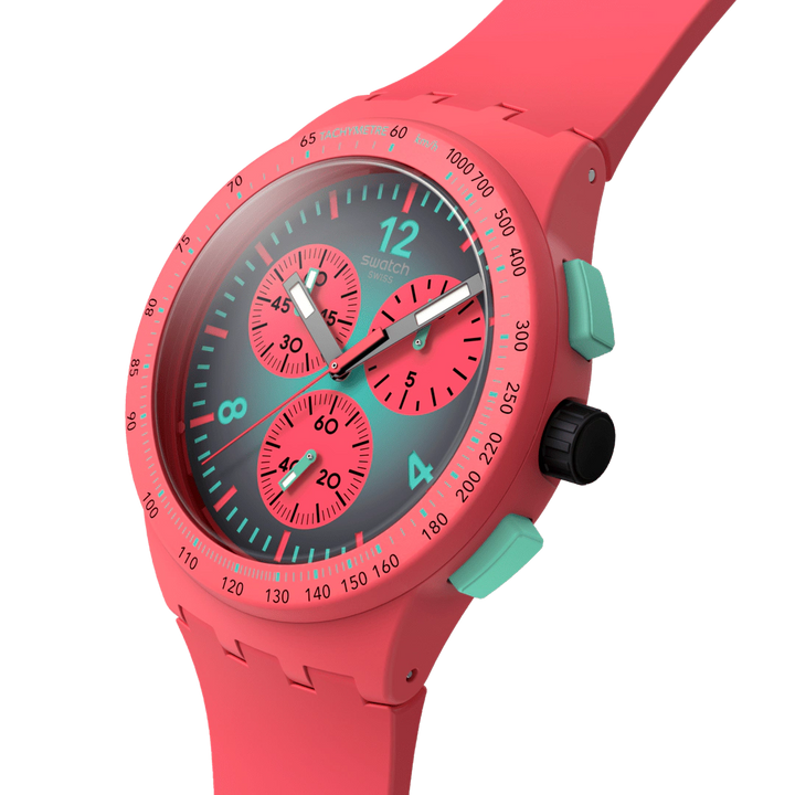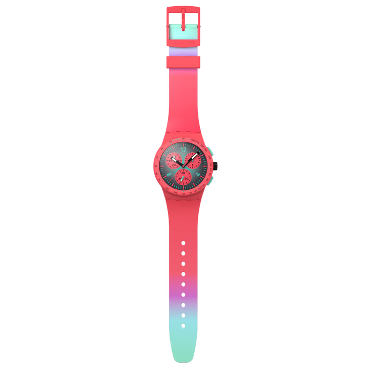 Chronograph cu un cadran turcoaz-verde în degrade, cu detalii multicolore, indicatoare negre fosforescente și secundar roz închis. Carcasa mată roz închis are un bezel asortat cu scală tahimetrică negru-turcoaz, butoane turcoaz mate și coroniță neagră. Cureaua în degrade roz închis–turcoaz, bucla și prinderile mate roz închis completează designul.