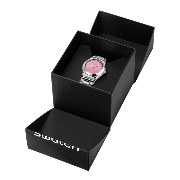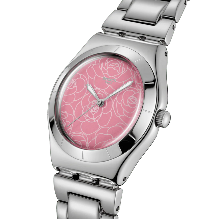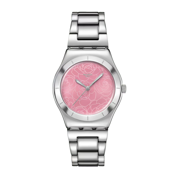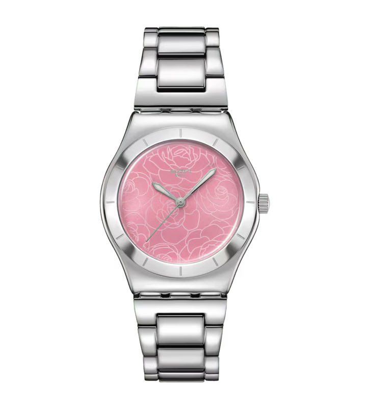 Acest ceas elegant din otel inoxidabil are un cadran roz cu finisaj sun-brushed, decorat cu un model floral alb imprimat. Are indicatoare de ora si minut in nuanta argintie, cu efect glow-in-the-dark, si un secundar tot argintiu. Ceasul are o carcasa din otel inoxidabil polisat si o luneta asortata, gravata cu marcaje orare. Bratara din otel inoxidabil polisat, cu inchidere tip fluture, completeaza aspectul.