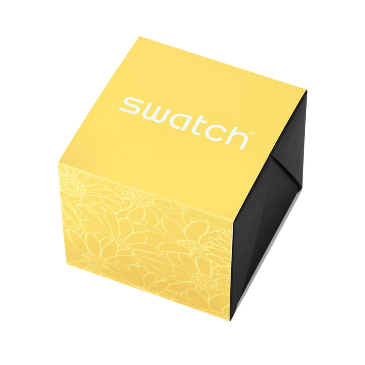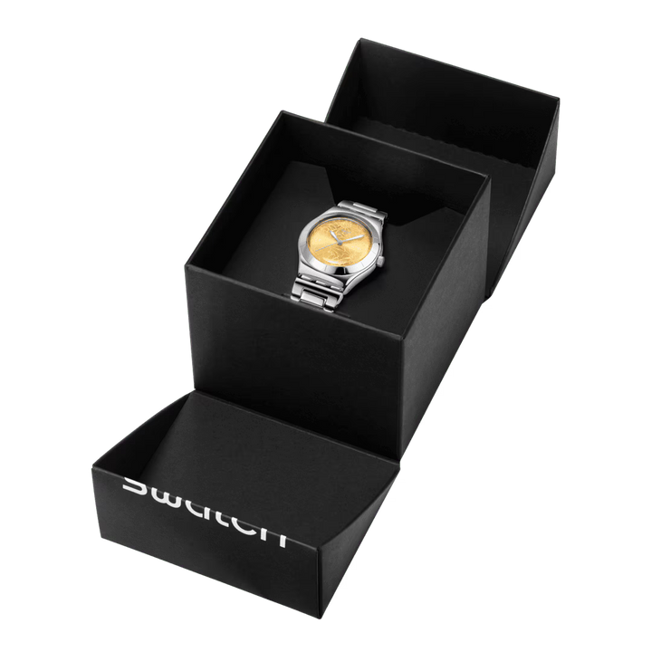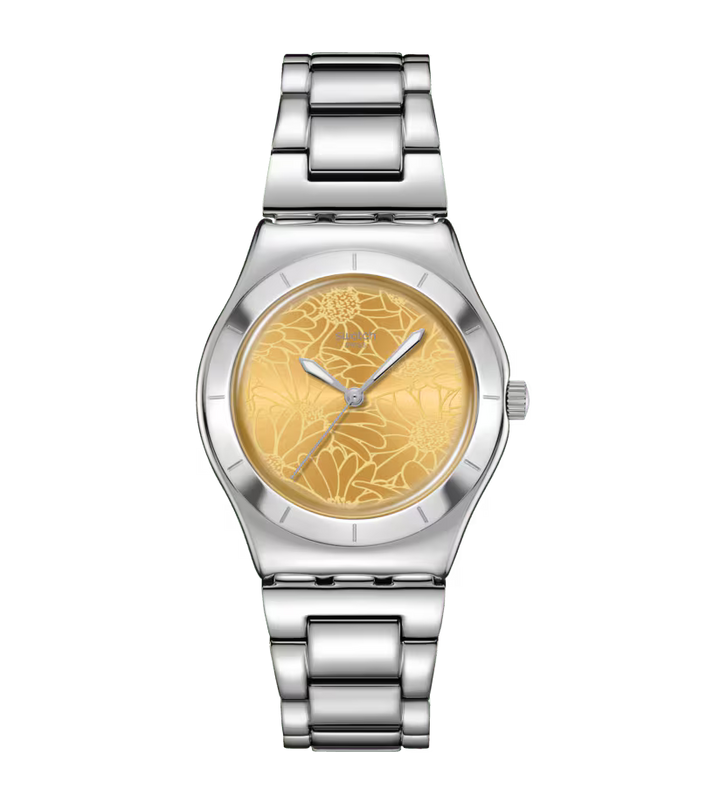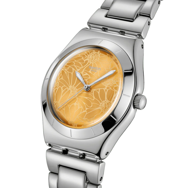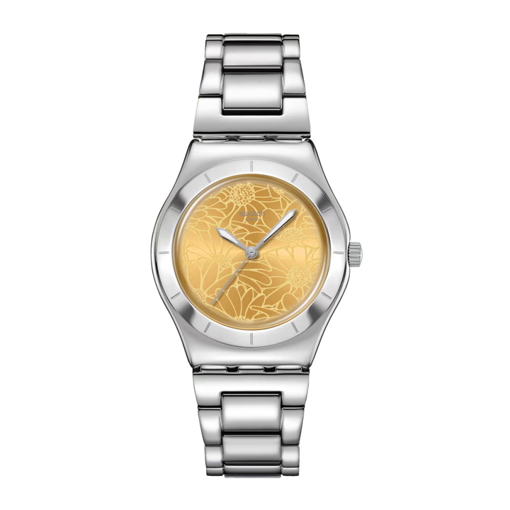 Acest ceas elegant din oțel inoxidabil are un cadran galben cu efect sun-brushed și un model floral galben deschis imprimat, cu indicatoare argintii pentru ore și minute cu efect fosforescent și o secundară argintie. Ceasul are o carcasă din oțel inoxidabil lustruit și un bezel asortat cu marcaje gravate pentru ore. O brățară din oțel inoxidabil lustruit cu închidere tip fluture completează aspectul.