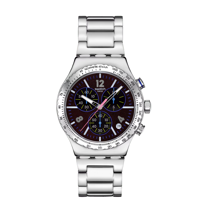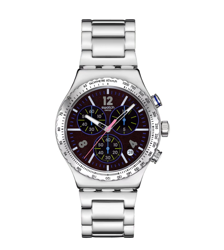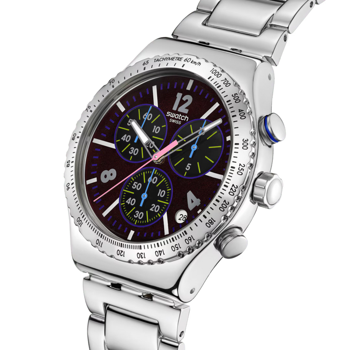 Acest cronograf are un cadran cu nuanțe care se schimbă de la rosu inchis la mov, cu cifre imprimate mov deschis, marcaje orare imprimate albe, pista minutelor imprimata mov, subcadrane negre cu imprimeu mov deschis si galben, precum si o fereastra pentru data intre orele 4 si 5. Limbile argintii pentru ore si minute stralucesc in intuneric, iar limba roz a secundelor pentru cronograf indica timpul. Carcasa din oțel inoxidabil lustruit este completata de o luneta asortata cu o scală tahimetrica gravata cu negru si o brata din otel inoxidabil lustruit, cu inchidere tip fluture.