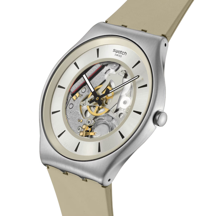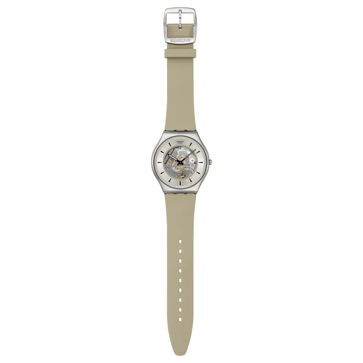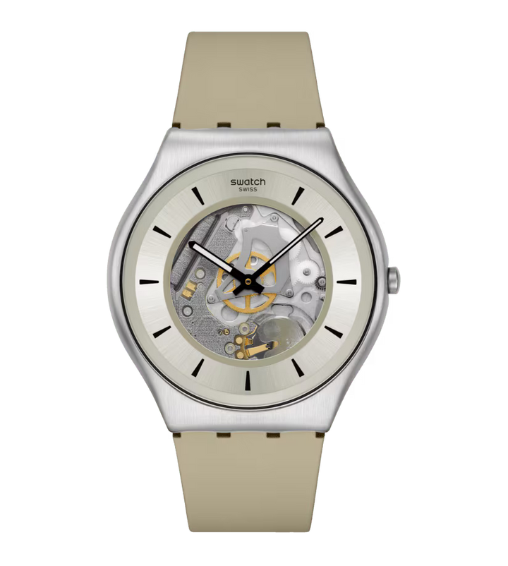 Prezentând un cadran deschis argintiu cu finisaj solar, un inel imprimat taupe, marcaje orare imprimate negre și ace negre pentru ore și minute care strălucesc în întuneric. Carcasa și catarama din oțel inoxidabil periat sunt asociate cu o curea taupe mată și o buclă asortată.