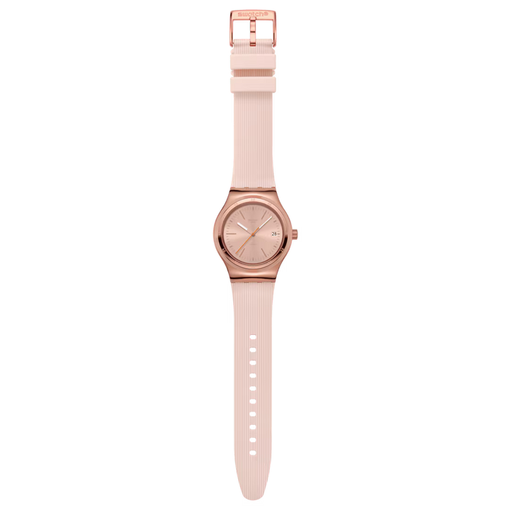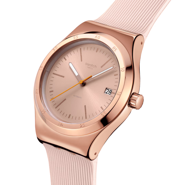 Acest ceas automatic are un cadran bej cu finisaj periat de tip sun-brushed, indecsi imprimati auriu-sclipitor si marcaj al minutelor, plus fereastra pentru data la ora 3. Limbile orei si ale minutelor sunt in nuanta rose-gold, cu efect luminos pe intuneric, iar secundarul portocaliu indica timpul. Carcasa lucioasa din otel inoxidabil cu PVD rose-gold este completata de o rama asortata si permite vizualizarea mecanismului SISTEM51 cu design imprimat digital pe spate. Cureaua texturata bej deschis, cu efect Anodamazing, bucle bej mate si catarama jumatate-otel lucios cu PVD rose-gold completeaza aspectul.