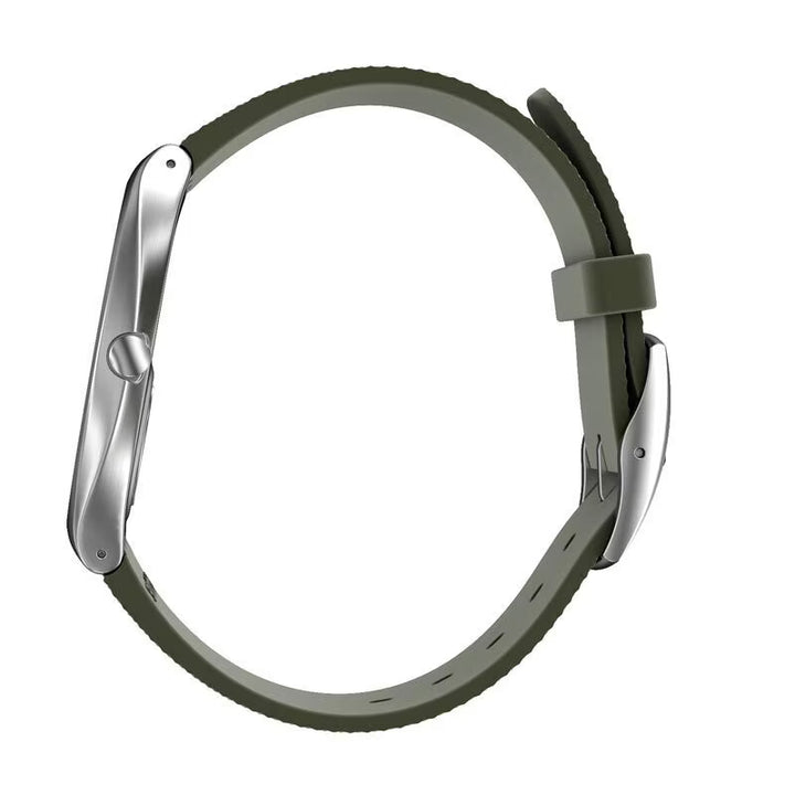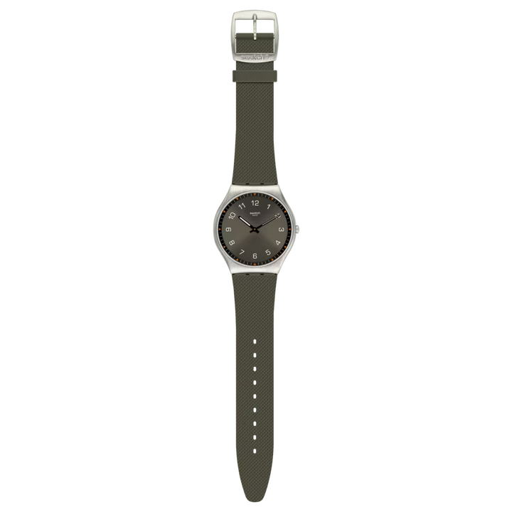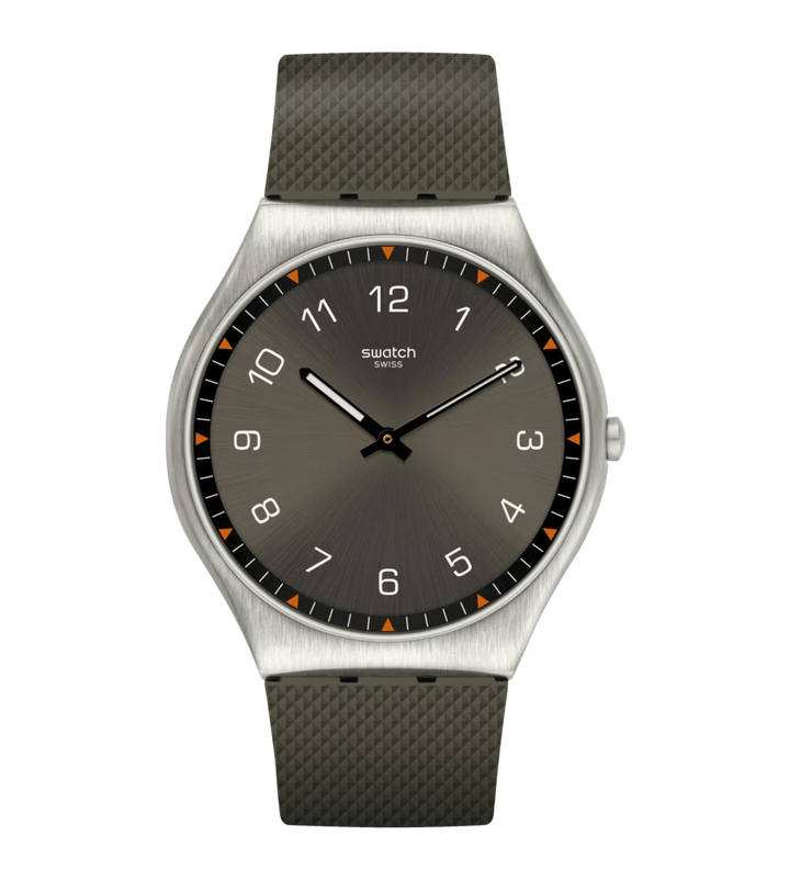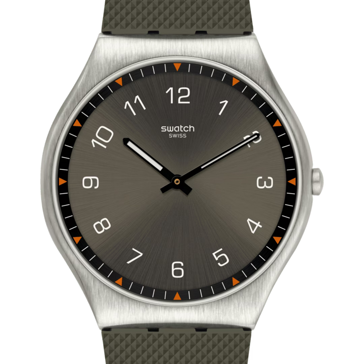 Înapoi la natură cu modelul SKINEARTH (SS07S103) — un ceas verde pământiu, ușor, cu o curea din cauciuc și un cadran satinat în tonuri de verde, completat de accente albe și portocalii.