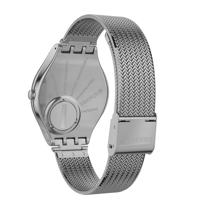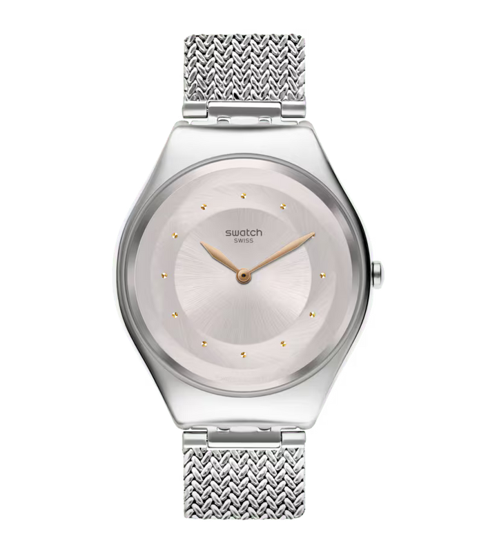 Fin ca o plaja cu nisip alb, SKINSAND (SYXS117M) are un cadran bej stralucitor cu un model satinat multidirectional. Ceasul SKINSAND este completat de o bratara tip milaneza.