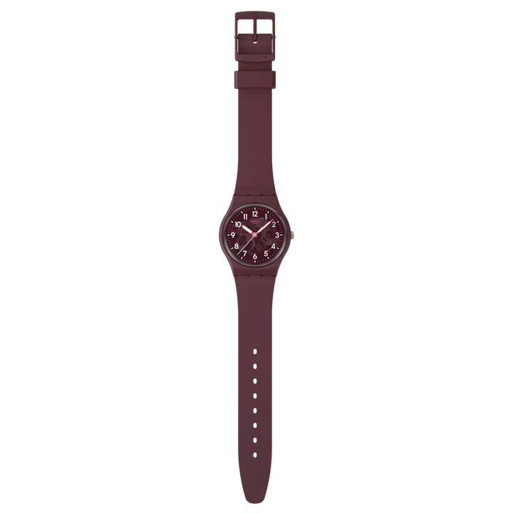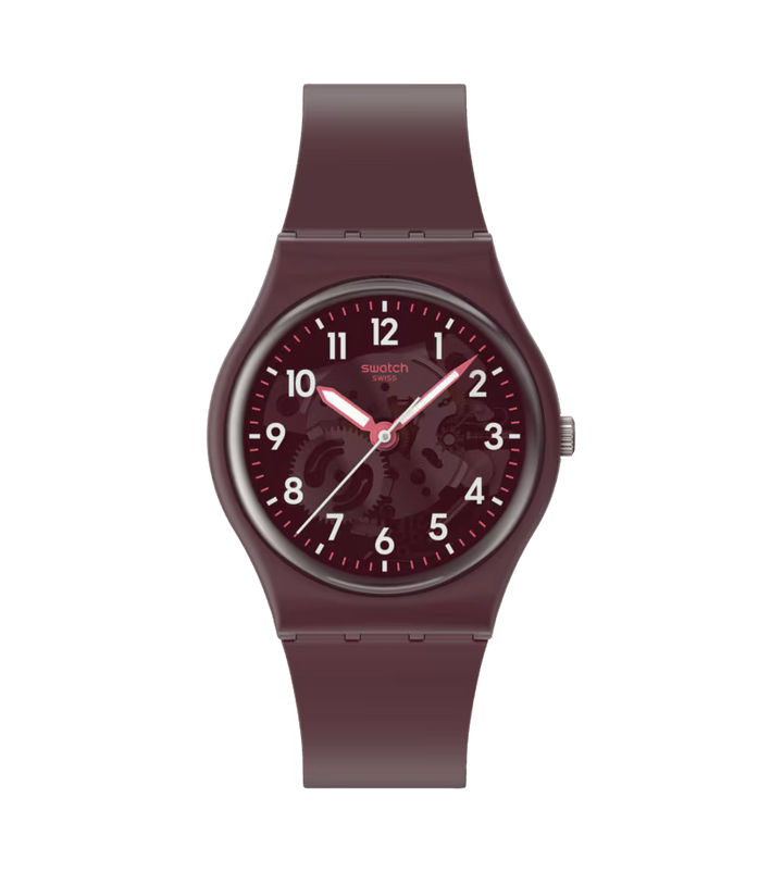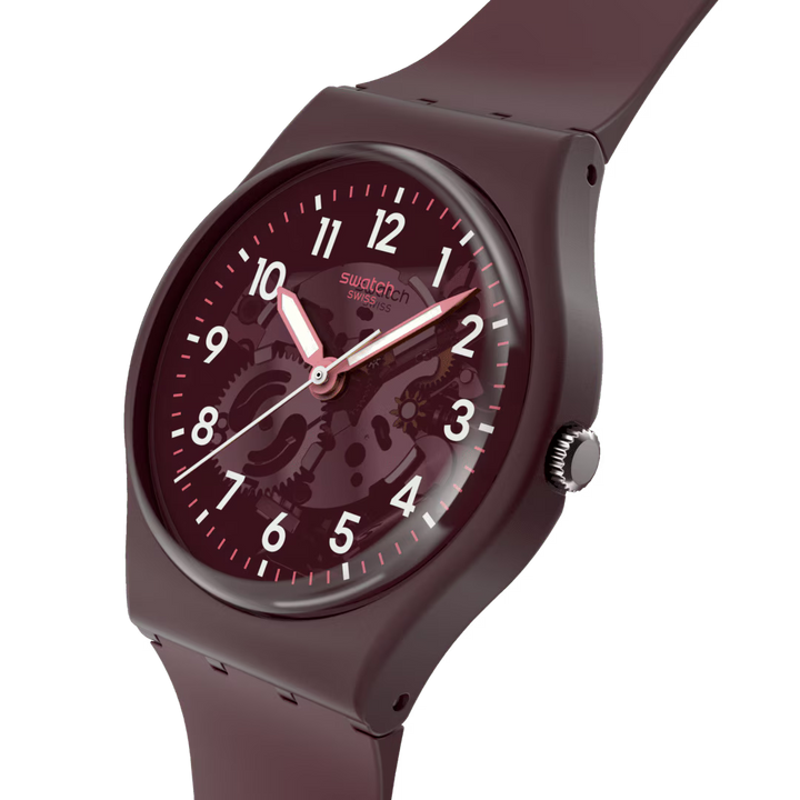 Ceasul are un cadran burgundy transparent care oferă o vedere a mecanismului și include cifre albe și un marcaj roz pentru minute, limbi roz pentru ore și minute cu efect fosforescent și o limbă albă pentru secunde, toate protejate de sticlă biosursată. Carcasa, cureaua, bucla și catarama burgundy mate, toate biosursate, completează aspectul.