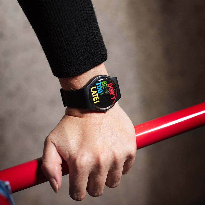 Mesajul se inspira din „don’t be too late” din 1984, primul mesaj ireverent si ironic imprimat vreodata pe un Swatch. Exista 3 variante: „same same but different” pe modelul Gent (observa diferenta... este o schimbare de culoare); „call to action” pe modelul New Gent; „tell me more” ca model decorativ pe mecanismul Sistem51 (disponibil in octombrie). Este imposibil de ratat – si te poti alatura cercului cu stilul care ti se potriveste cel mai bine. Si, desigur, cea mai potrivita notiune a timpului: fiecare ceas poarta numele cuvantului TIME in una dintre numeroasele limbi ale lumii.