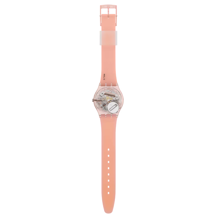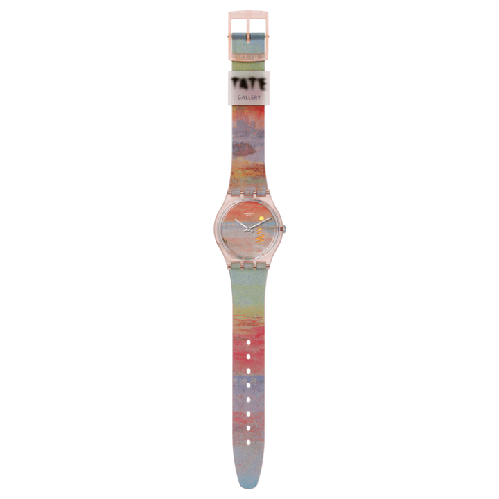 Acest ceas din colecția Swatch x Tate Gallery are o carcasă transparentă, lucioasă, roz, din materiale bio-sursate și geam bio-sursat. Cadranul și cureaua roz mat transparentă prezintă o reproducere a operei lui JMW Turner, The Scarlet Sunset. Acul orar și minutar argintii, cu efect fosforescent, indică ora, iar soarele de pe cadran își schimbă subtil culoarea zilnic datorită rotiței speciale de calendar în mai multe culori. Loop-ul transparent mat este imprimat cu logo-ul Tate Gallery. Joseph Mallord William Turner, The Scarlet Sunset, cca. 1830–40. Foto: Tate / © Tate