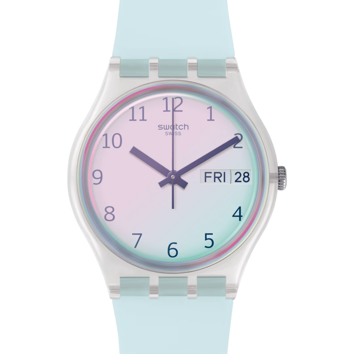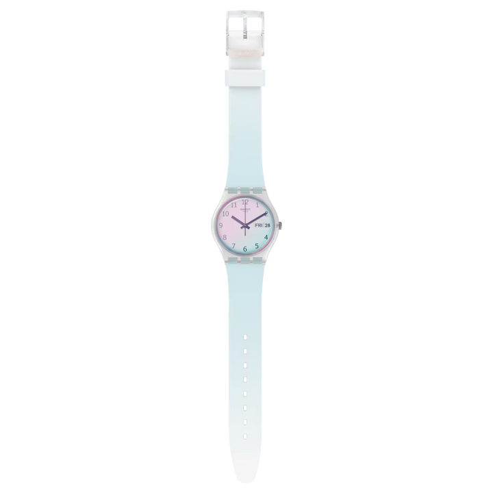 Albastrul cerului ULTRACIEL (GE713) imprastie norii. Cureaua bleu se potriveste perfect cu cadranul alb, care este acoperit de un geam Swatch Solar Spectrum bleu deschis.