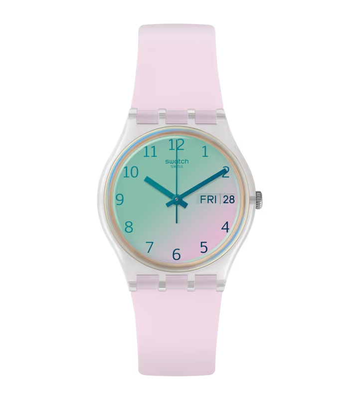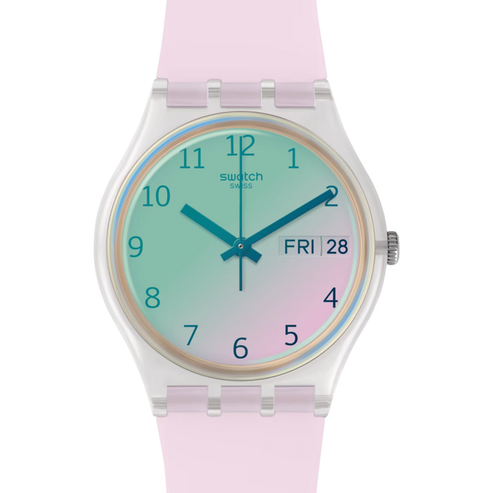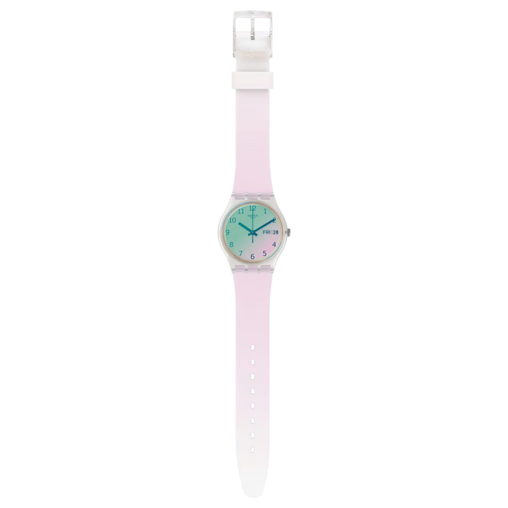 ULTRAROSE (GE714) are un aspect roz guma de mestecat, cu o curea semi-transparenta si imprimeu roz perfect. Geamul roz Swatch Solar Spectrum coloreaza cadranul alb si imprimeul gri.