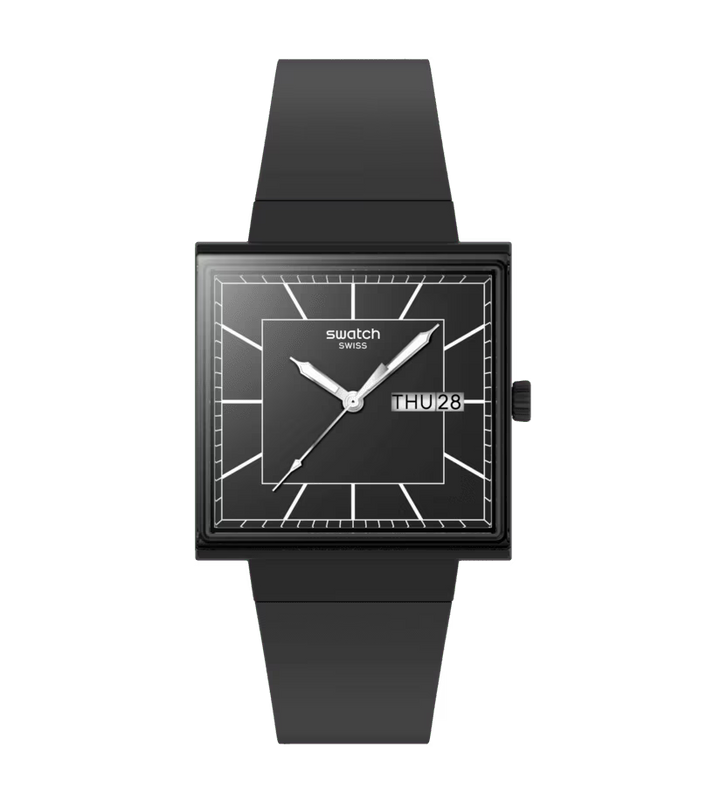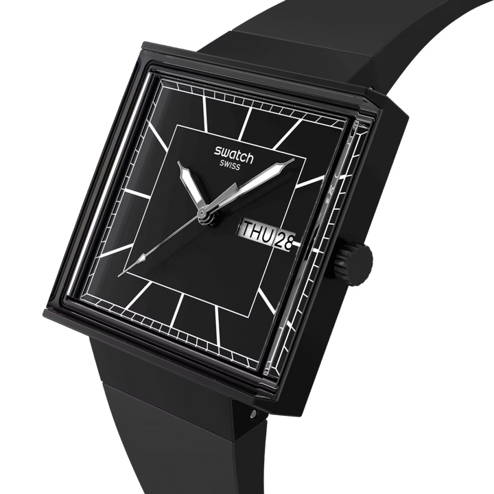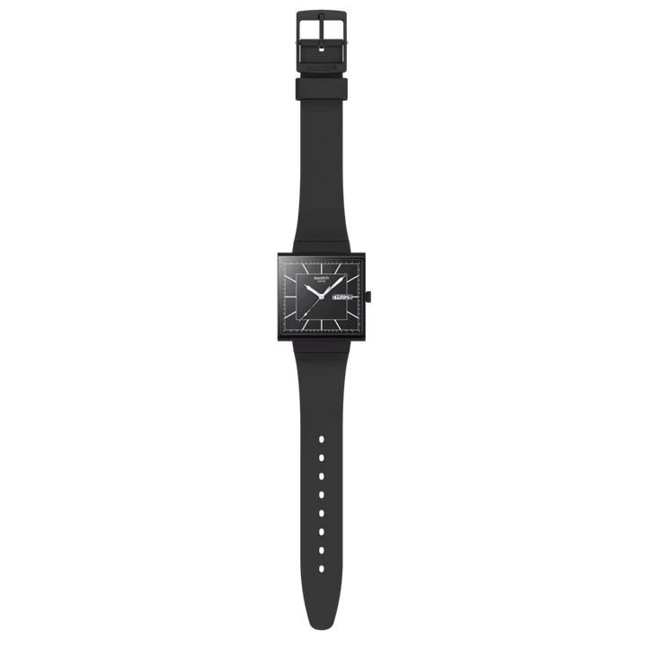 Carcasa patrata, negru mat, din BIOCERAMIC, are sticla biosource edge-to-edge care ofera o vedere laterala a indexilor si a cercului de minute imprimate cu alb. Cadranul patrata negru are limbi argintii pentru ore, minute si secunde, cu efect fosforescent, si o fereastra pentru zi-data la ora 3. Cadranul este completat de o curea negru mat biosource, integrata, cu o bucla biosource asortata si o catarama BIOCERAMIC. Capacul bateriei imprimat pe spate infatiseaza o vedere frontala a ceasului.